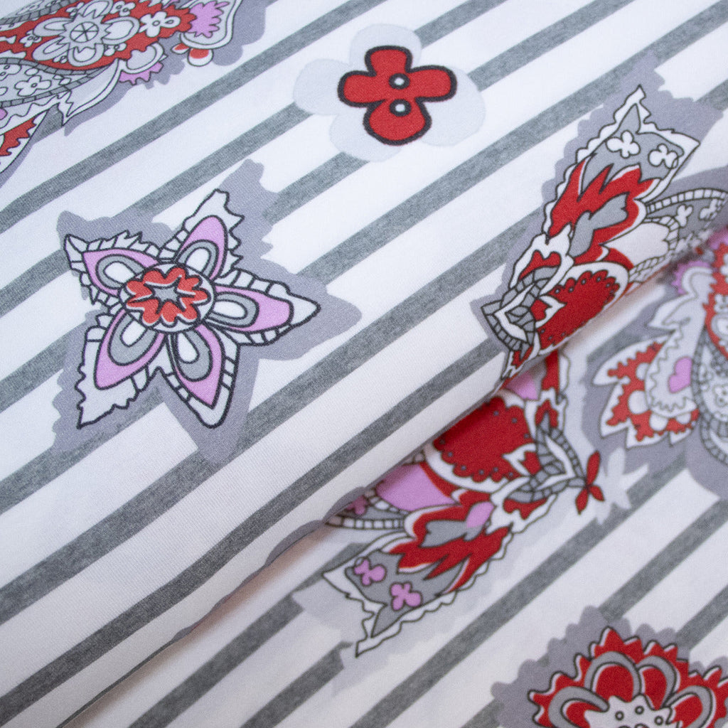 Modernes Viskose-Jersey Panel mit abstrakten Motiven in klassischem Weiß – ein vielseitiger Stoff für zeitgenössische Designs. Das großzügige Format (ca. 80 cm × 160 cm) bietet optimale Schnittplanung für Kleider, Shirts und andere Nähprojekte. Viskose-Jersey besticht durch seine weiche Griffigkeit, natürliche Feuchtigkeitsaufnahme und eleganten matten Glanz. Das Material fällt geschmeidig und bietet ausgezeichnete Trageigenschaften mit angenehmer Elastizität. Die abstrakten Muster ermöglichen kreative Gestaltungsspielräume und verleihen Fertigstücken modernen Charakter. Ideal für Näherinnen, die Wert auf hochwertige Materialien und zeitlose Ästhetik legen.