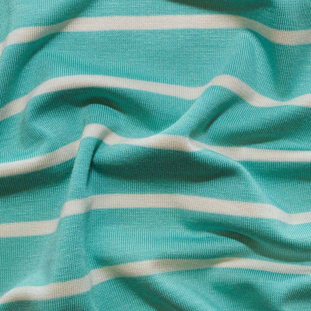 Dieser wunderbar weiche Viskose-Jersey besticht durch sein elegantes Streifenmuster in Türkis und Wollweiß. Der fließende Stoff schmiegt sich angenehm an die Haut und eignet sich perfekt für gemütliche Shirts, luftige Kleider oder entspannte Loungewear. Die natürliche Viskose sorgt für hervorragende Atmungsaktivität und einen sanften Griff – ideal für warme Tage und kuschelige Momente zugleich. Ein Klassiker, der in keiner Stoffsammlung fehlen darf!
