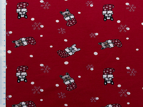 Jersey Weihnachten - Weihnachtsbulldoggen Dieser fröhliche Kinderstoff vereint festliche Weihnachtsmotive mit niedlichen Bulldoggen-Designs. Der hochwertige Jersey bietet optimale Tragekomfort und Bewegungsfreiheit für aktive Kinder. Das Material ist strapazierfähig, pflegeleicht und eignet sich hervorragend für Kinderkleidung, Pyjamas oder gemütliche Freizeitoutfits. Die leuchtenden Farben und verspielten Muster begeistern kleine Weihnachtsfans und machen jedes Kleidungsstück zu einem Lieblingsstück. Ideal für die Adventszeit und darüber hinaus.