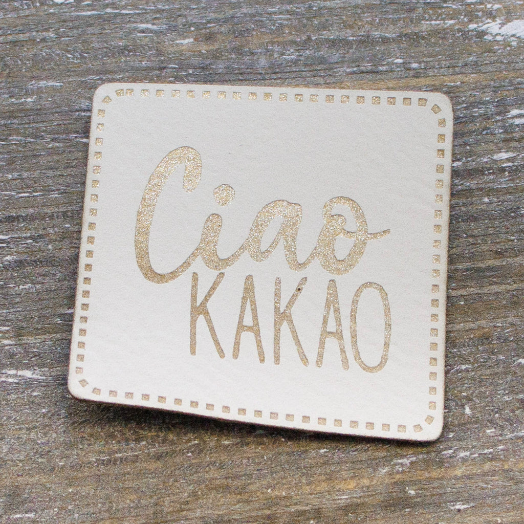 Süßes Kunstleder-Label mit dem verspielten "Ciao Kakao"-Design in zartem Wollweiß – ein absoluter Hingucker für deine Nähprojekte! Dieses KDS-Label verleiht Taschen, Rucksäcken, Decken und Co. sofort einen persönlichen Touch mit italienischem Flair. Das cremefarbene Kunstleder harmoniert wunderbar mit verschiedensten Stoffen und Farbpaletten. Perfekt für kreative Köpfe, die ihre handgefertigten Meisterwerke mit einem hochwertigen Label veredeln möchten.
