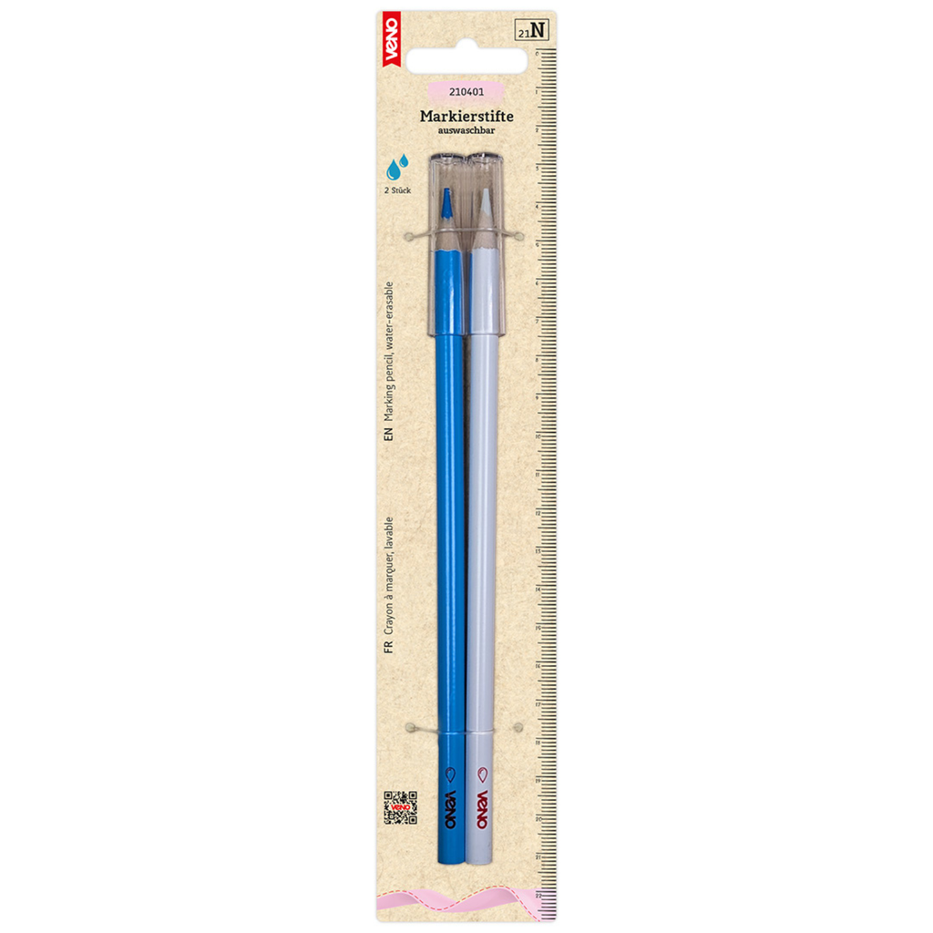 Dieses Set umfasst zwei auswaschbare Markierstifte in Weiß und Blau, ideal für präzises Markieren auf Stoffen beim Nähen. Die Stifte bieten klare, gut sichtbare Linien, die sich nach Abschluss der Arbeit mühelos und rückstandsfrei entfernen lassen. Perfekt für das Anzeichnen von Nahtzugaben, Schnittlinien oder Mustern, unterstützen sie eine saubere und professionelle Verarbeitung für detailgenaue Nähprojekte. Ein unverzichtbares Werkzeug für effizientes und sauberes Arbeiten mit Textilien.