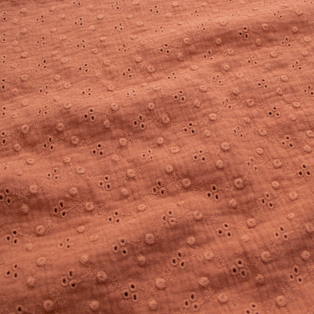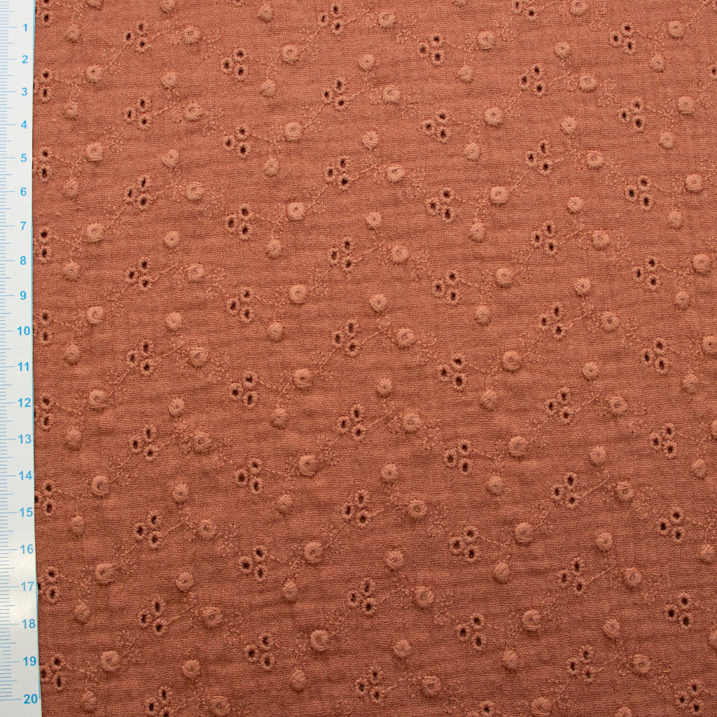 Zartes Musselin-Abenteuer wartet auf dich! Dieses wunderbar leichte Double-Gauze-Baumwollgewebe besticht durch filigrane Lochstickerei mit zierlichen Ranken – perfekt für luftige Sommerkleider, elegante Blusen oder verspielte Accessoires. Die doppelte Gewebestruktur sorgt für angenehme Stabilität, während die durchbrochenen Muster dem Stoff eine romantische, fast schwebende Leichtigkeit verleihen. Ideal für alle, die Handwerk lieben und Textilien mit Charakter bevorzugen.