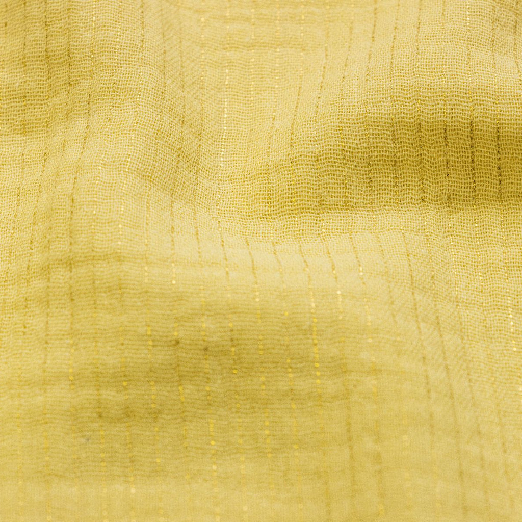 Zartes Musselin trifft auf modernen Glanz – unser Double Gauze Baumwollstoff in leuchtendem Gelb mit feinen Metallic-Streifen ist ein echtes Highlight für kreative Projekte. Die luftig-leichte Webart macht ihn perfekt für fließende Sommerkleidung, kuschelige Babytextilien oder verspielte Accessoires. Die glänzenden Akzente verleihen jedem Nähprojekt das gewisse Etwas – ob elegant oder verspielt, dieser Stoff setzt garantiert Akzente. Ideal für alle, die es lieben, ihre Kreativität zum Strahlen zu bringen.