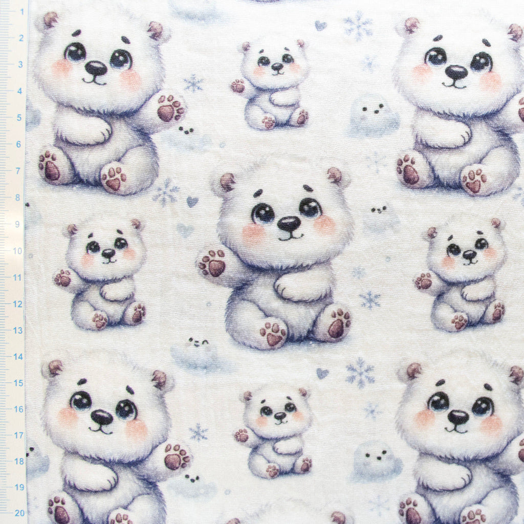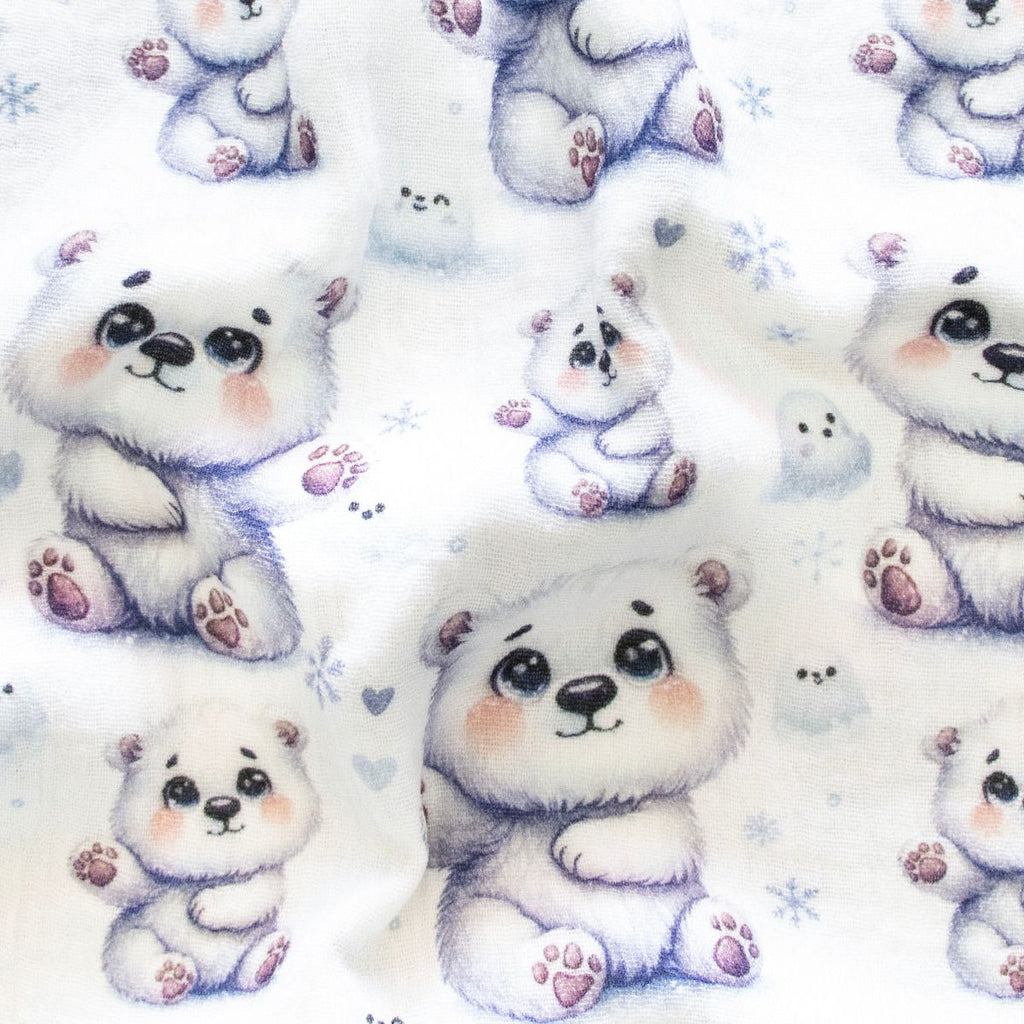 Flauschige Eisbären-Freunde auf zartem Stoff! Dieses wunderbar weiches Musselin-Double-Gauze-Gewebe besticht mit süßen Eisbären im minimalistischen Design auf reinem Weiß. Das leichte, atmungsaktive Material eignet sich hervorragend für kuschelige Babykleidung, verspielte Kindermode oder gemütliche Heimtextilien. Die hochwertige Baumwollqualität sorgt für Tragekomfort und Langlebigkeit – ideal für empfindliche Haut. Perfekt für alle, die Polarfreunde lieben und gleichzeitig zeitlose Eleganz schätzen!