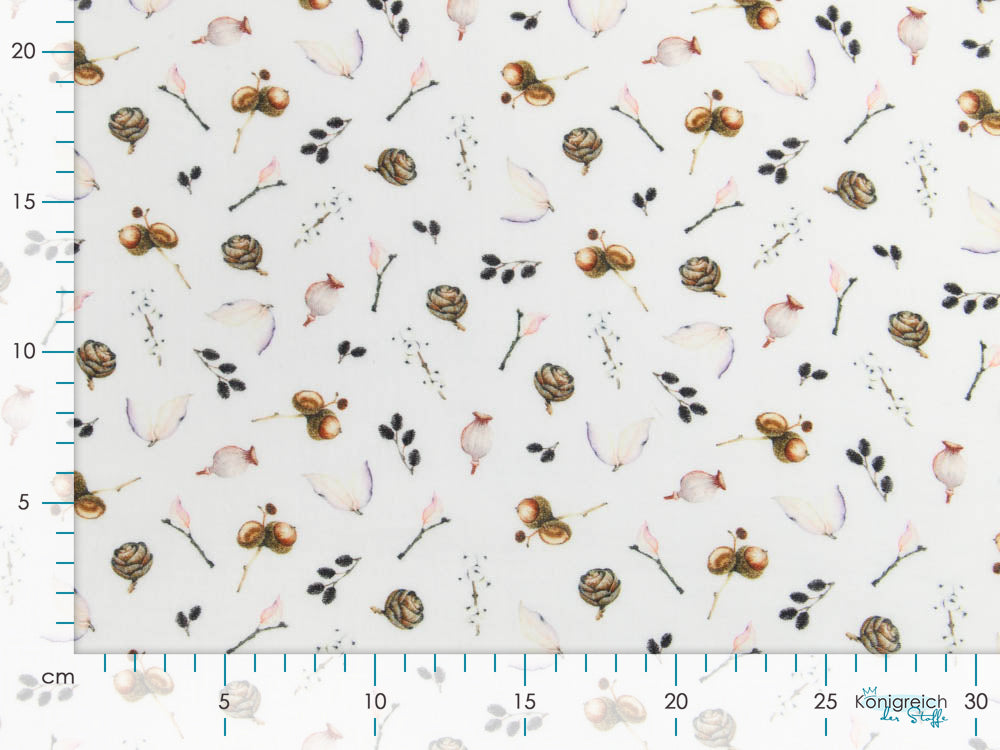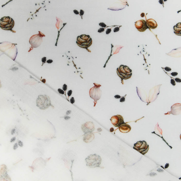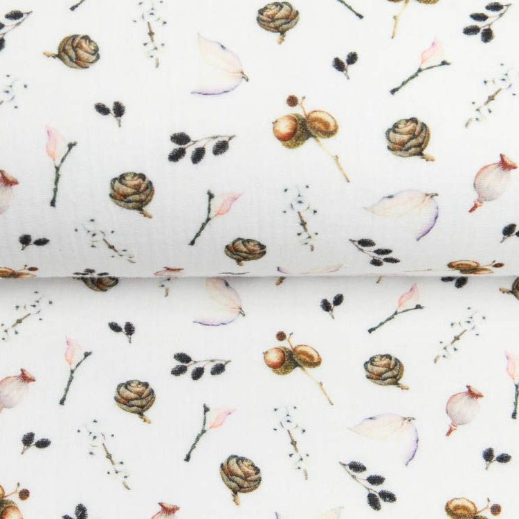Träume süß mit diesem wunderbar weichen Musselin Double Gauze! Das zarte Gewebe besticht durch seinen charmanten Digitaldruck mit Eicheln und Zweigen im klassischen Weiß – perfekt für kuschelige Babybekleidung, leichte Decken oder verspielte Accessoires. Die doppellagige Gaze bietet optimale Atmungsaktivität und sanfte Haptik auf empfindlicher Haut. Ob für kleine Abenteurer oder gemütliche Momente – dieser Stoff bringt Natur und Gemütlichkeit in jedes Projekt!