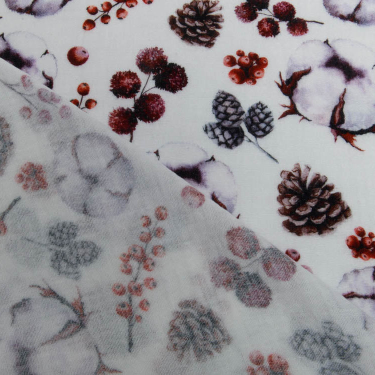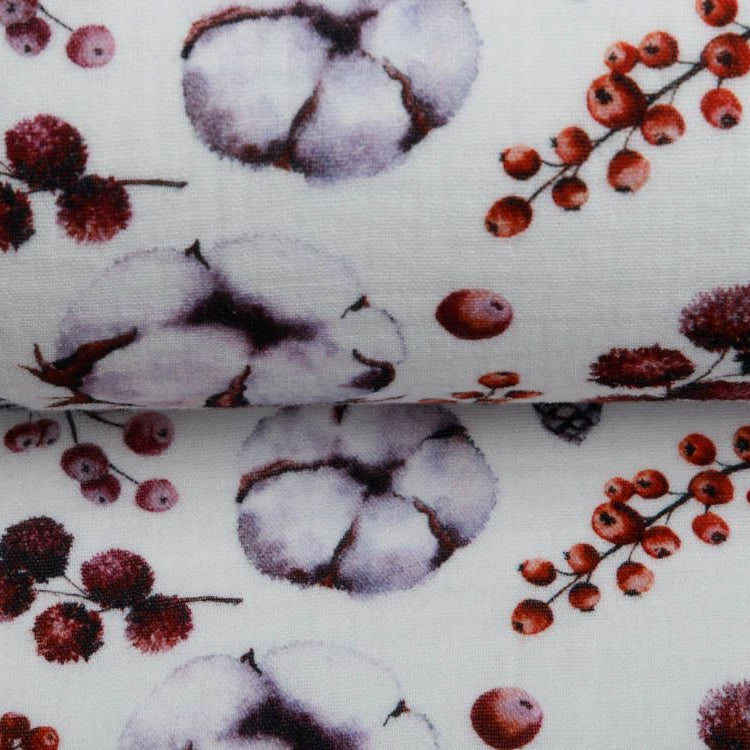 Verwandle deine Nähprojekte in botanische Kunstwerke mit diesem herrlichen Musselin Double Gauze! Zarte Baumwollblüten und rustikale Tannenzapfen schmücken den feinen Digitaldruck auf strahlendem Weiß – ein Design, das Natur und Gemütlichkeit perfekt vereint. Die leichte, doppellagige Gaze atmet wunderbar und fühlt sich federleicht auf der Haut an – ideal für Babybodys, luftige Sommerkleidung oder mollige Kuscheldecken. Lass dich von dieser naturinspirierten Schönheit verzaubern und kreiere Lieblingsstücke voller Charme!