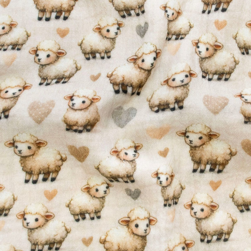 Wollige Träumer auf zartem Stoff! Dieses herrlich weiches Musselin-Double-Gauze-Gewebe verzaubert mit niedlichen Schafen im gemütlichen Design auf hellem Beige. Das leichte, atmungsaktive Baumwollmaterial schmiegt sich angenehm an und eignet sich wunderbar für beruhigende Babykleidung, verspielte Kindermode oder kuschelige Decken. Die hochwertige Verarbeitung sorgt für Langlebigkeit und Tragekomfort – perfekt für kleine Schäfchen und ihre Lieblingsstücke. Lassen Sie sich von dieser sanften Weideland-Kollektion inspirieren!