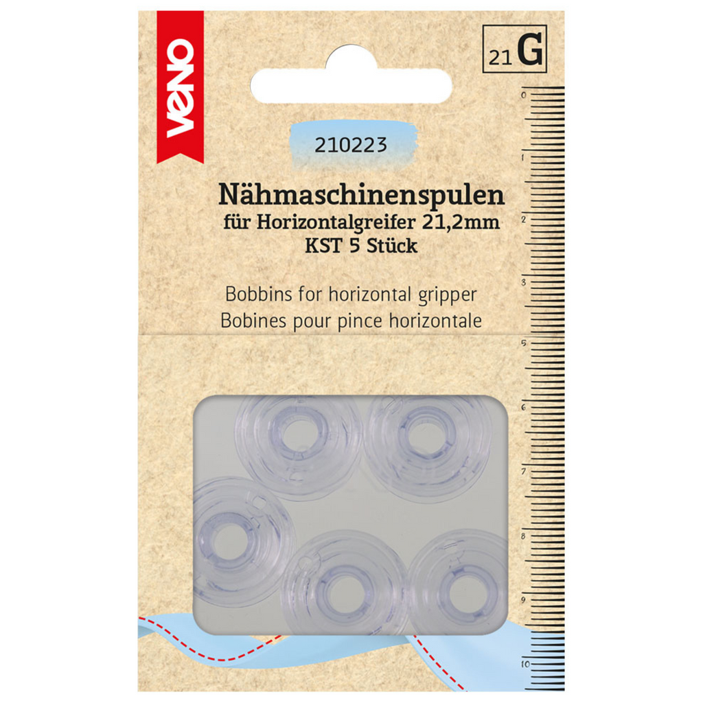 Mit diesen Nähmaschinenspulen für Horizontalgreifer bist du bestens ausgerüstet! Im MaxiCase befinden sich fünf Stück mit einem Durchmesser von 21,2 mm und einer Tiefe von 9,2 mm – perfekt für ein reibungsloses Näherlebnis. Schnell gewechselt und stets bereit, deine kreativen Projekte zum Leben zu erwecken!