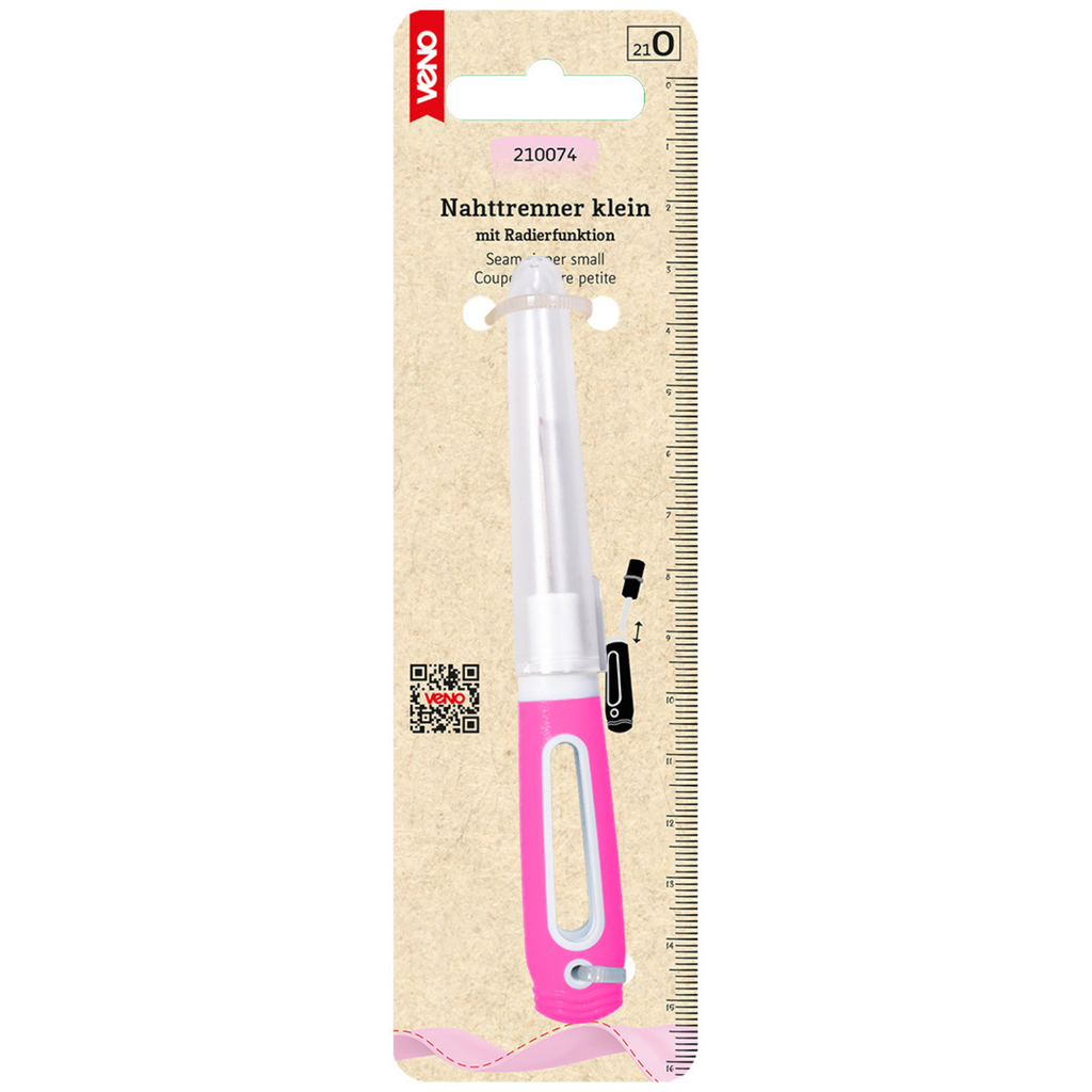 Der kleine Nahttrenner mit Radierfunktion verfügt über einen Gummi-Radierer an einem Ende, der Fadenreste nach dem Auftrennen der Naht sauber entfernt. Mit diesem präzisen Werkzeug lassen sich Schnitte in den Nähten schnell und schonend ausführen, ohne den Stoff zu beschädigen. Es ist ideal, um kleine Fehler zu korrigieren oder Nähte vorsichtig zu öffnen – ein unverzichtbarer Helfer für anspruchsvolle Näharbeiten.