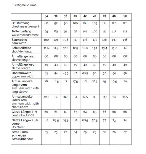 In dem Blusenschnitt Uma findest du zwei Ärmelvarianten, eine lange Version mit fertigem Bündchen und eine 3/4 lange Variante die als Abschluß ein Gummiband im Tunnelzug bevorzugt. Durch den Ansatz eines tellerförmigen Schnittteils bekommt der Ärmel die benötigte Weite, diese Naht kannst du mit Hilfe einer farbigen Paspel zusätzlich betonen. Der Blusenkragen und die Knopfleiste in der vorderen Mitte vervollständigen diese frühlingshafte Bluse.