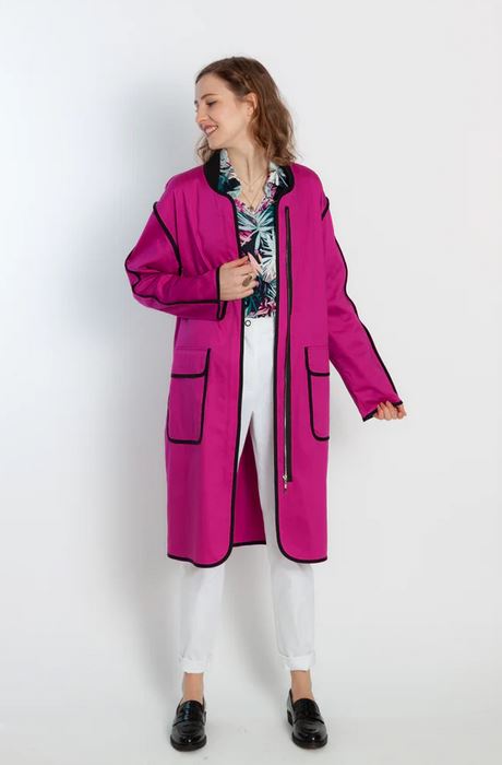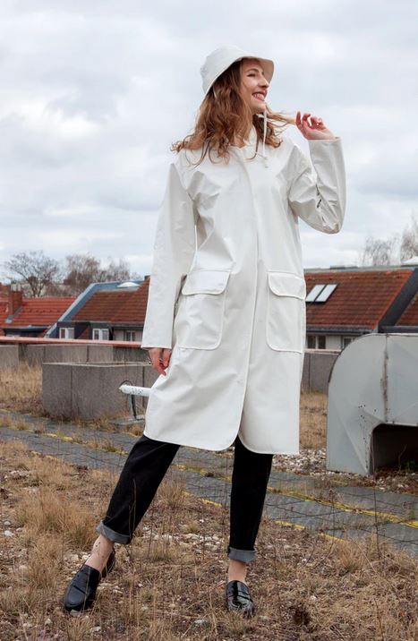 Unser ungefütterter Sommermantel hat auffällige Einfassungen entlang der Kanten. In einer Kontrastfarbe kommen diese besonders gut zur Geltung, gleichzeitig müssen die Nähte nicht versäubert werden. Durch den unter gesteppten Strickkragen hast du die Möglichkeit Undine mit und ohne Kragen zu nähen. Die ausgesetzten Taschen sind ebenfalls eingefasst und der Reißverschluss nur auf, bzw. unter gesteppt. Unser Mantel aus dem weißen Lackstoff zeigt dir, dass du Undine natürlich auch mit den Nähten nach innen verarbeiten kannst.