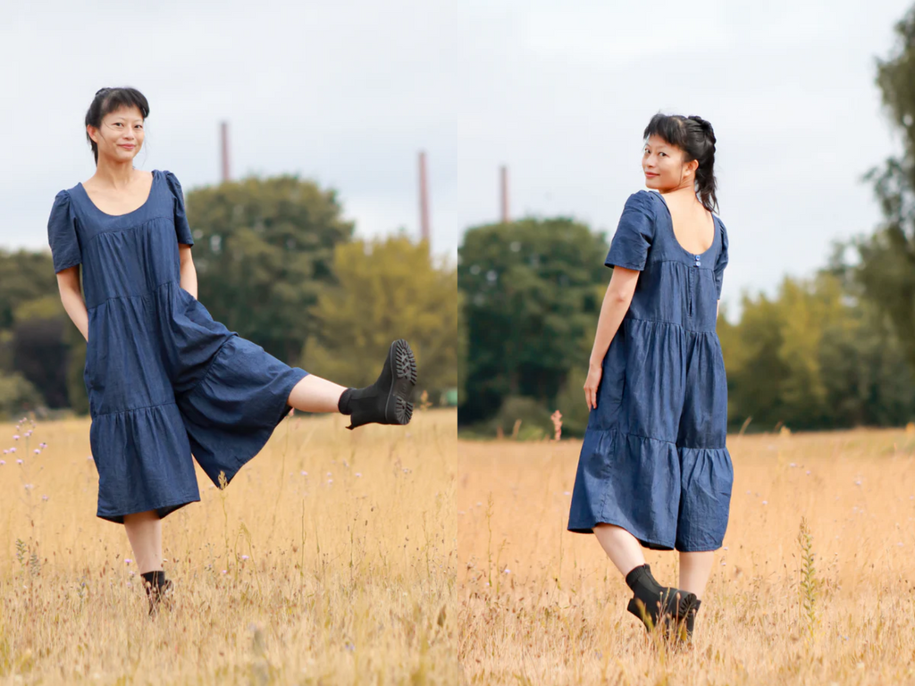 Noch mehr Varianten möglich: Der Overall lässt sich auch als Kleid zuschneiden. Die 3 unteren Rüschen werden dann einfach in der vorderen und hinteren Mitte im Bruch zugeschnitten.
