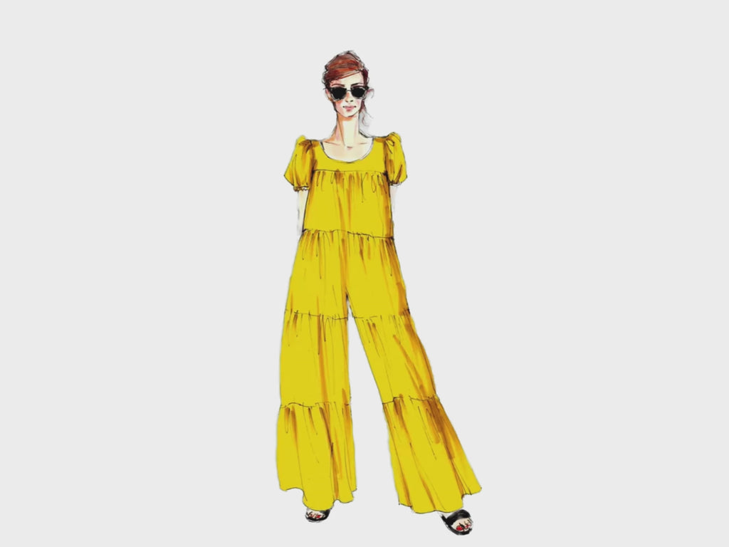 Aus diesem vielseitigen Schnittmuster kannst du nicht nur einen traumhaften Overall, sondern auch einen Jumper mit kurzen Beinen, ein Maxikleid, ein Hängerchen und sogar eine Bluse ableiten.