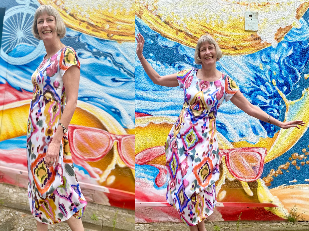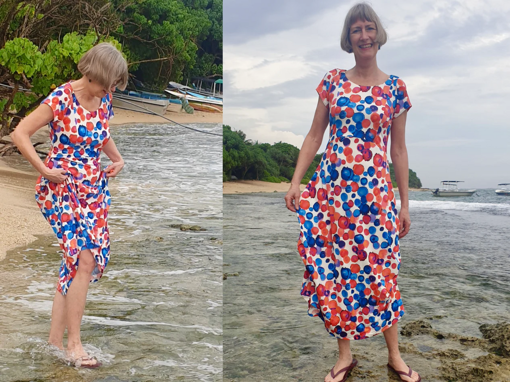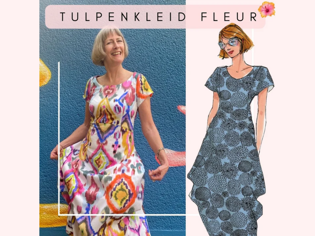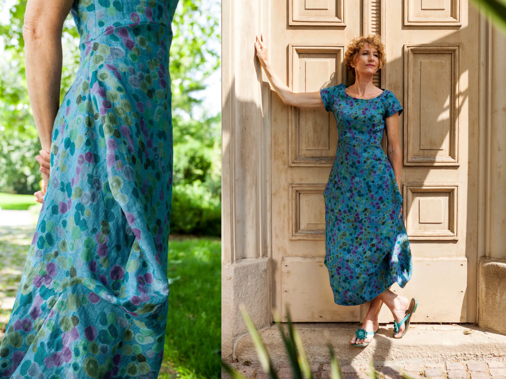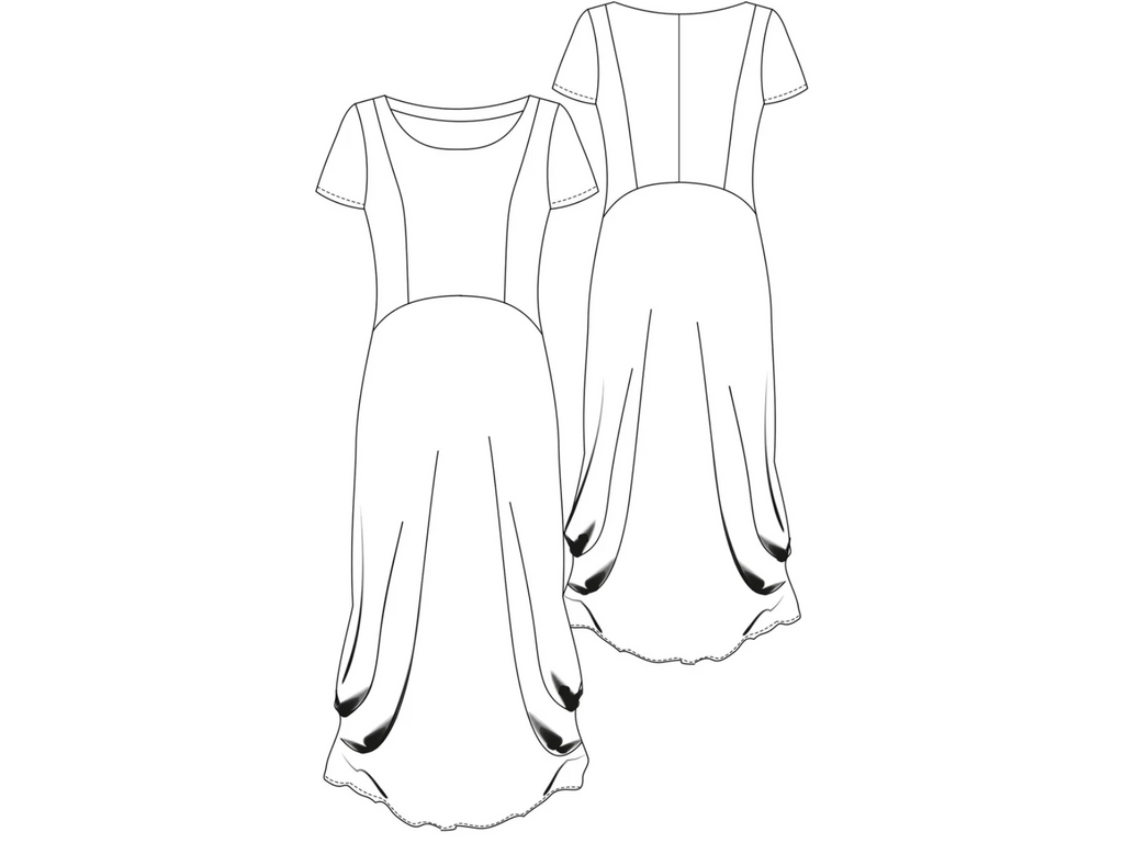 Du suchst ein Sommerkleid, das oben wie ein schönes konfektioniertes Kleid sitzt, aber eine lässige und innovative Rockform hat? Dann ist der Schnitt Fleur genau das, was du brauchst. Das Kleid hat einen flachen Rundhalsausschnitt, der die Halspartie betont, und schmale kurze Ärmel. Die Prinzessnaht (eine Teilungsnaht, die in die Schulter verläuft) sorgt für die tolle Passform. Die leicht erhöhte Taille verläuft in einem schwungvollen Bogen von der Mitte zur Seite.