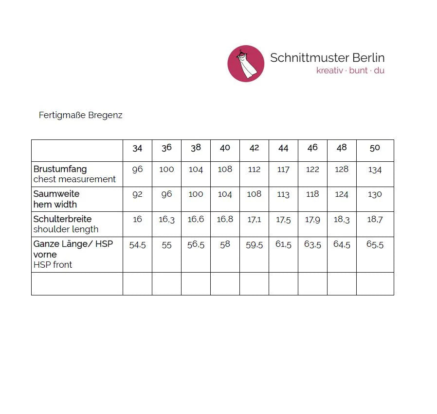 Hersteller: Schnittmuster Berlin Ringbahnstraße 105-107 12103 Berlin Deutschland info@schnittmuster-berlin.de