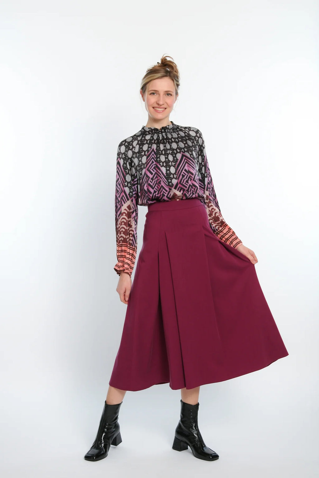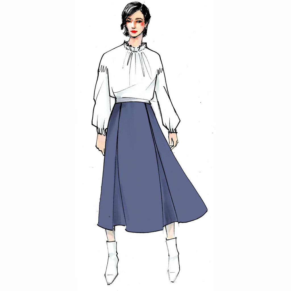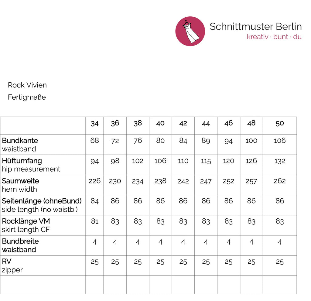 Der weit schwingende Midirock Vivien kleidet dich an kühlen Tagen ebenso wie in den sonnenreichen Monaten. Entsprechend gestylt, mit oder ohne Strumpfhose, Stiefel oder Sneaker, Vivien ist ein echtes Allround - Schnittmuster. Die gelegten Falten im Vorderteil werden ein Stück abgesteppt, dadurch ist der obere Bereich schön schmal und fällt weich zum schwingenden Saum.