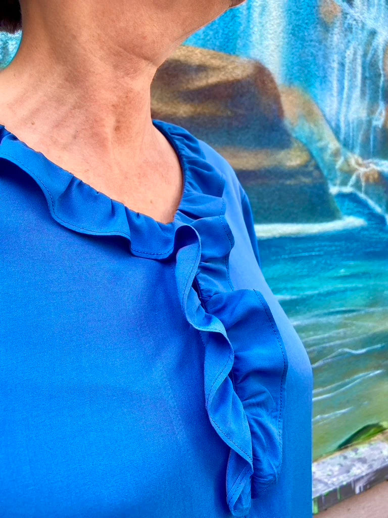 Der geschwungene V-Ausschnitt wird von einer eingekrausten Rüsche umrahmt, die deinem Outfit eine feminine Note verleiht. Du kannst den Ausschnitt mit einer charmanten Schlaufe und einem kleinen Knopf schließen, sodass er optisch kürzer wird – so passt du die Bluse ganz nach deinem Stil an!