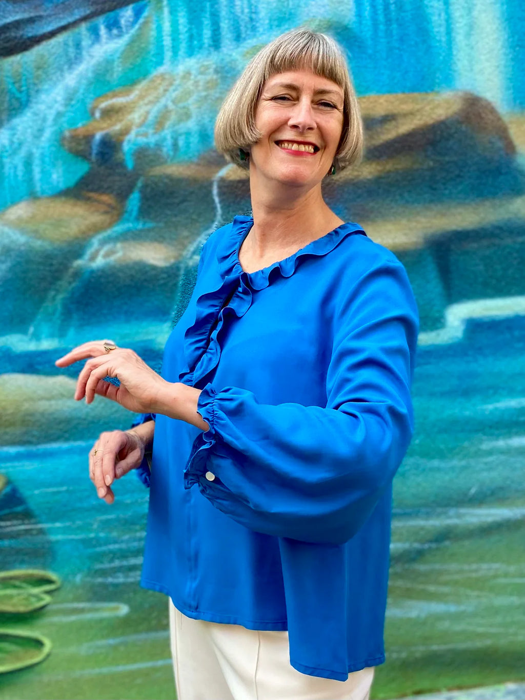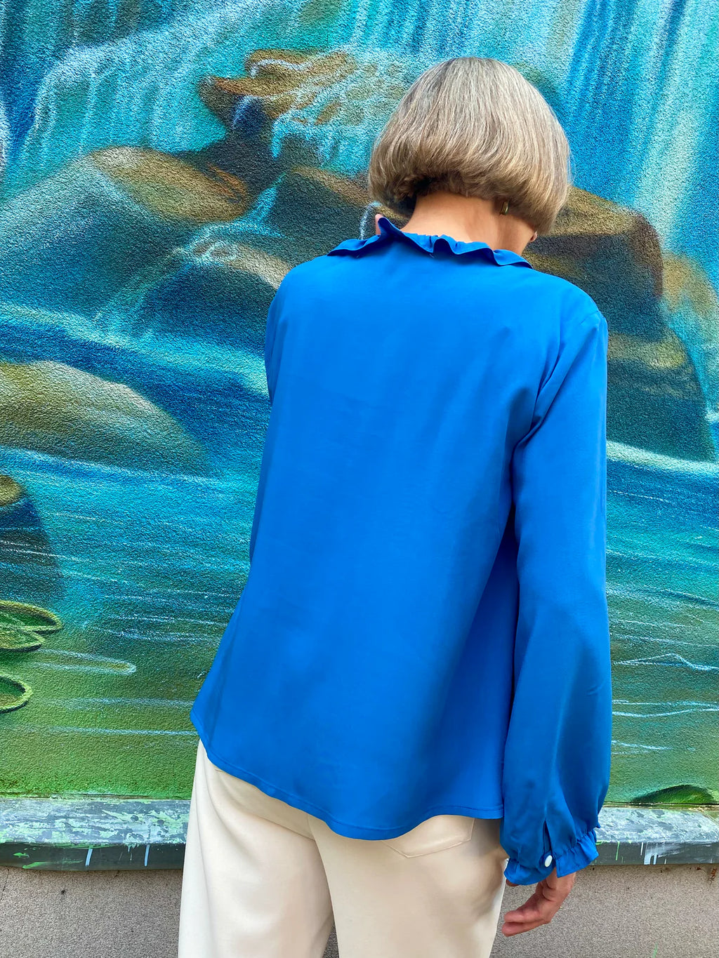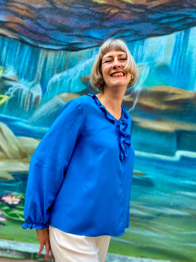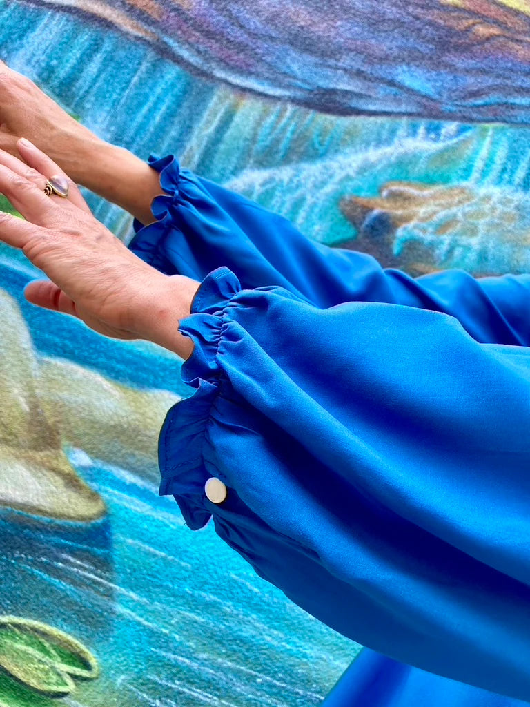Die Ärmel sind ebenfalls ein Highlight: Sie enden mit einer angesetzten Rüsche und einem kleinen Ärmelschlitz, der ebenfalls mit einer Schlaufe und einem Knopf versehen ist. Diese raffinierten Details machen die Bluse Bristol zu einem echten Blickfang!
