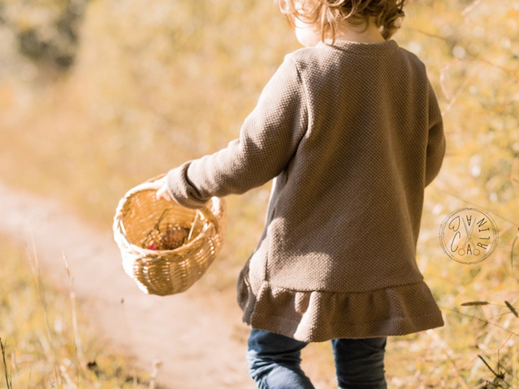 Der Cozy Cardigan ist speziell für Strickstoffe gedacht. Du kannst ihn natürlich aber auch aus Waffeljersey, French Terry oder Jacquard nähen. Wenn du Grobstrick vernähst, würde ich dir empfehlen, die gerade Version ohne Volant zu nähen und den Halsausschnitt mit Beleg zu nähen.