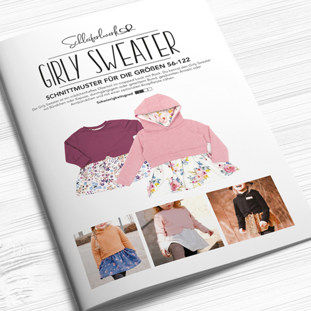 Der Girly Sweater ist ein mädchenhaftes Oberteil im cropped Look mit Rock. Du kannst den Girly Sweater mit Bündchen oder Kapuze, durchgängigem oder geteiltem Bund, gesäumten Ärmeln oder Armbündchen und mit einer optionalen Knopfleiste nähen.
