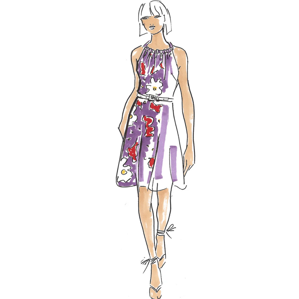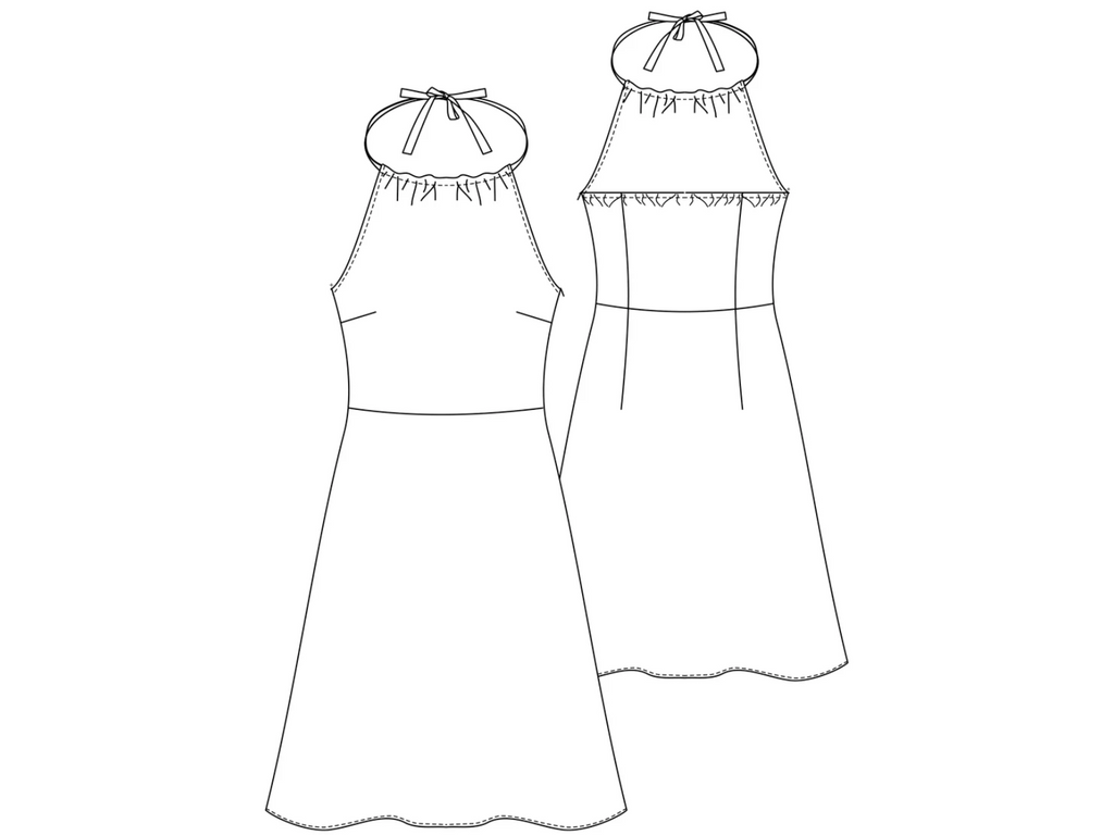 Das Kleid Aimee ist perfekt für richtig heiße Sommertage. Mit Neckholderband, Rückenausschnitt und weit schwingendem, knielangem Rock ist es ein angenehmes und luftiges Sommerkleid. Ein schöner Stoffdruck kommt bei diesem Kleid besonders gut zur Geltung.