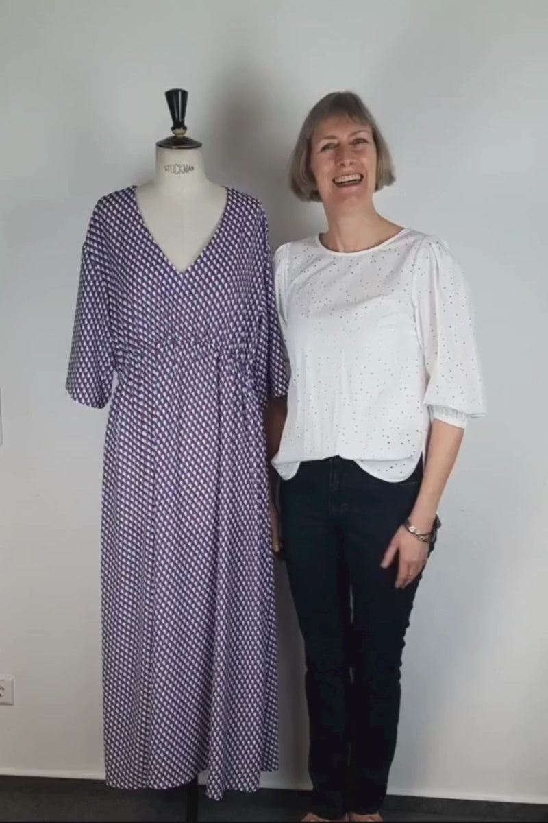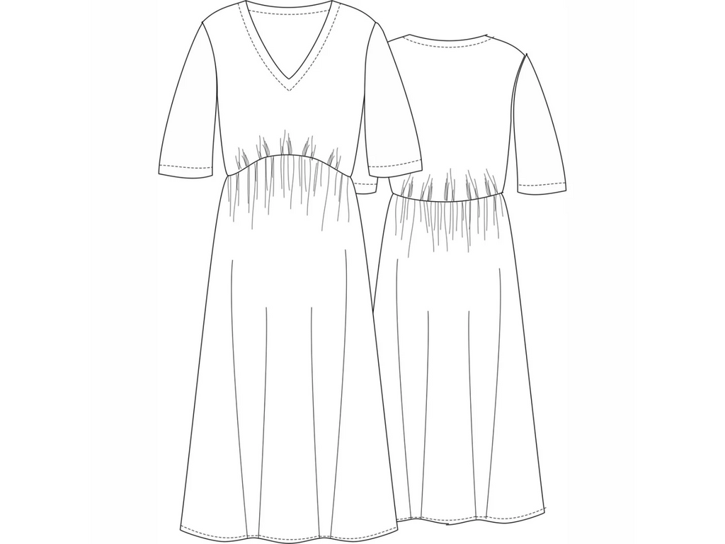 Sommerkleider in einer Midi - Länge sind schwer im Trend. Jill hat einen V- Ausschnitt und dreiviertellange, weite Ärmel. Die Weite des Rocks wird in der gerundeten Naht oberhalb der Taille mit einem schmalen Gummiband zusammengerafft. Gefällt dir Jill in einer kürzeren Variante besser, dann kürze die Rocklänge einfach um den gewünschten Betrag.