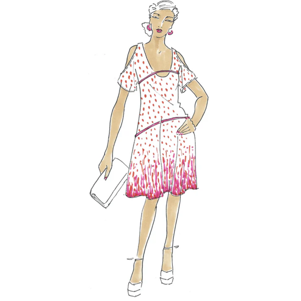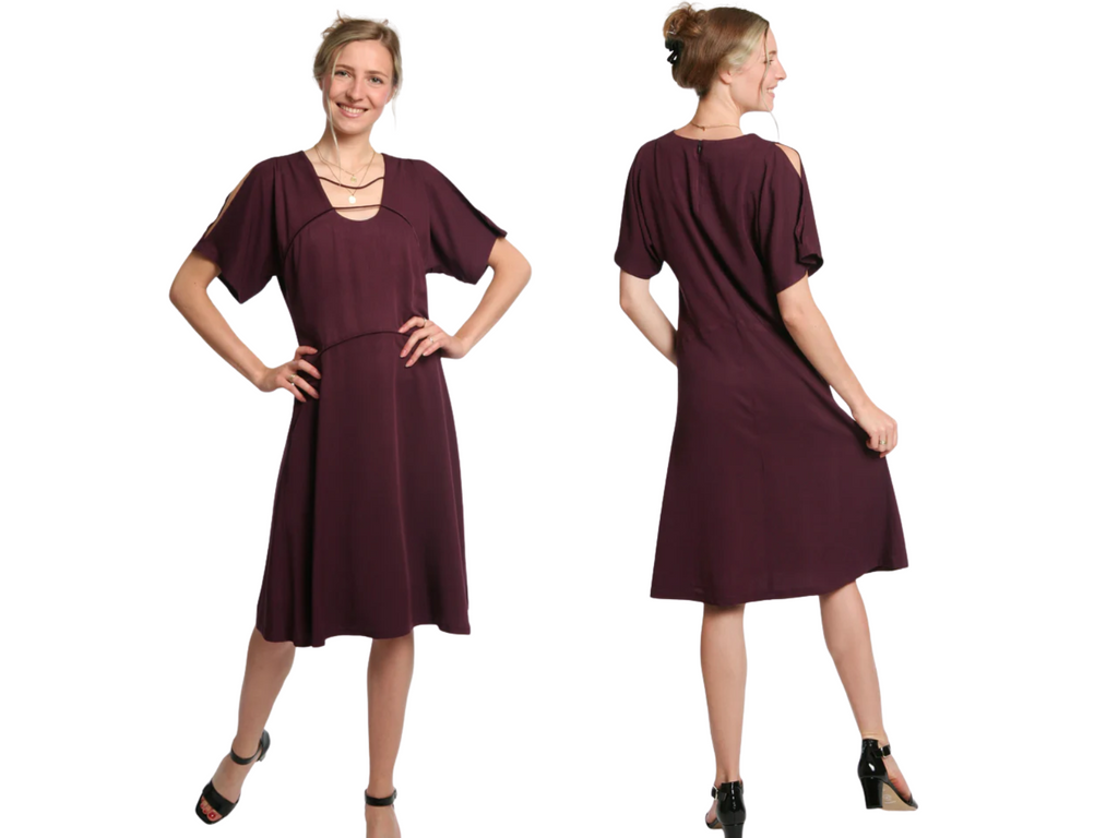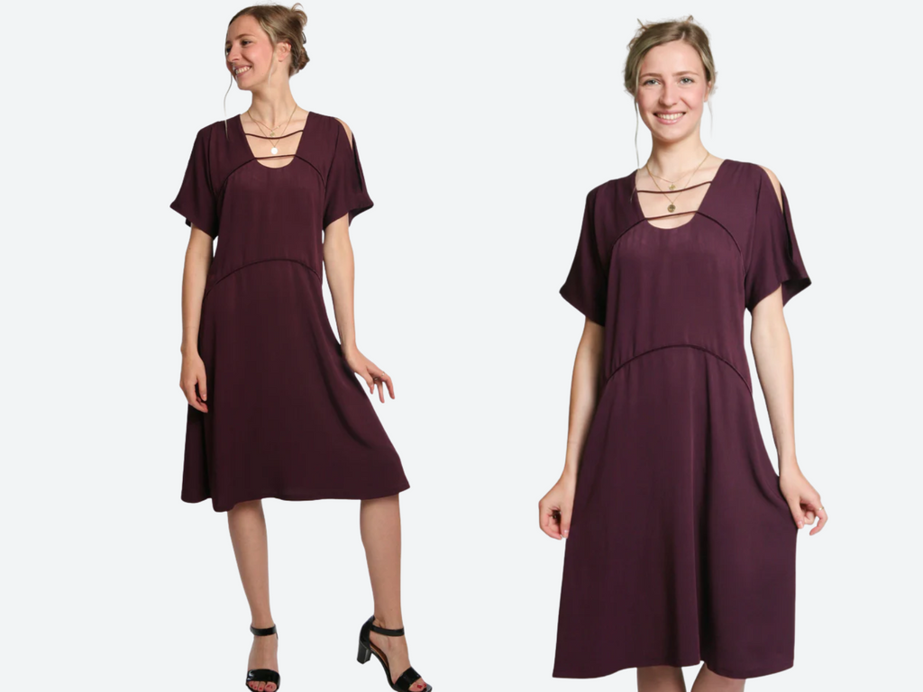 Unser Sommerkleid Finola überzeugt mit einer ausgefallenen Schnittführung und schönen Details. Das A-förmige Kleid schwingt durch den ausgestellten Saum lässig leicht. Die überschnittenen Schultern und der weite Ausschnitt sitzen schön locker. Die farbigen Paspel in den Teilungsnähten auf Hüft- und Brusthöhe sind zusätzliche Hingucker und betonen die besondere Linienführung.