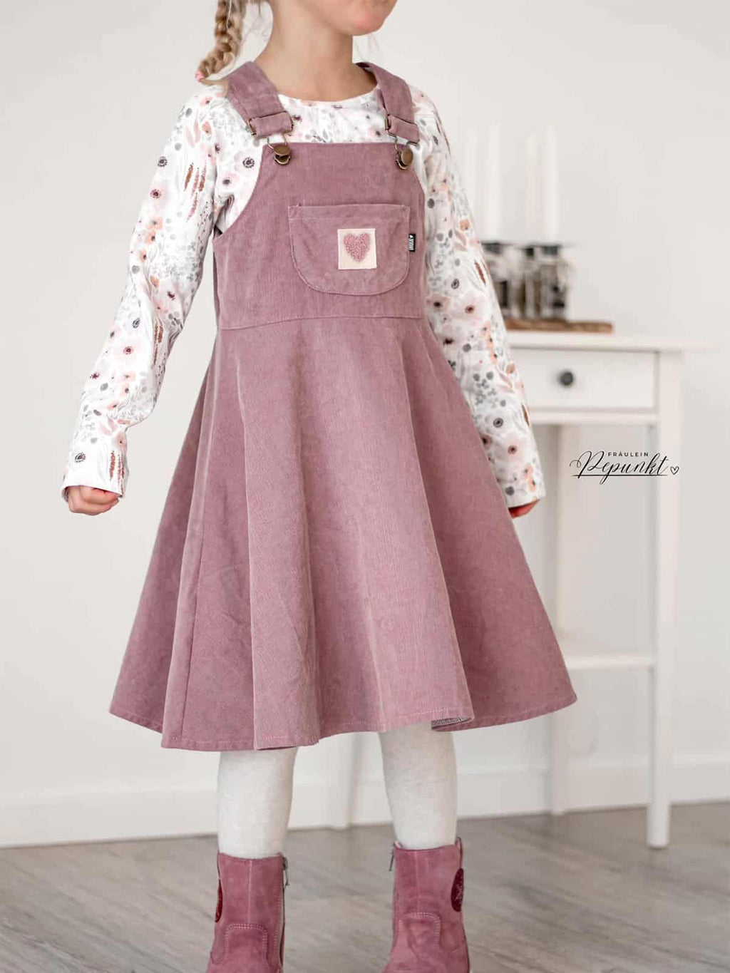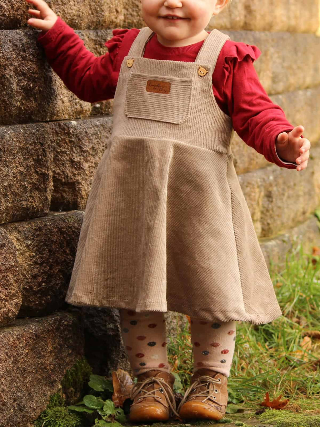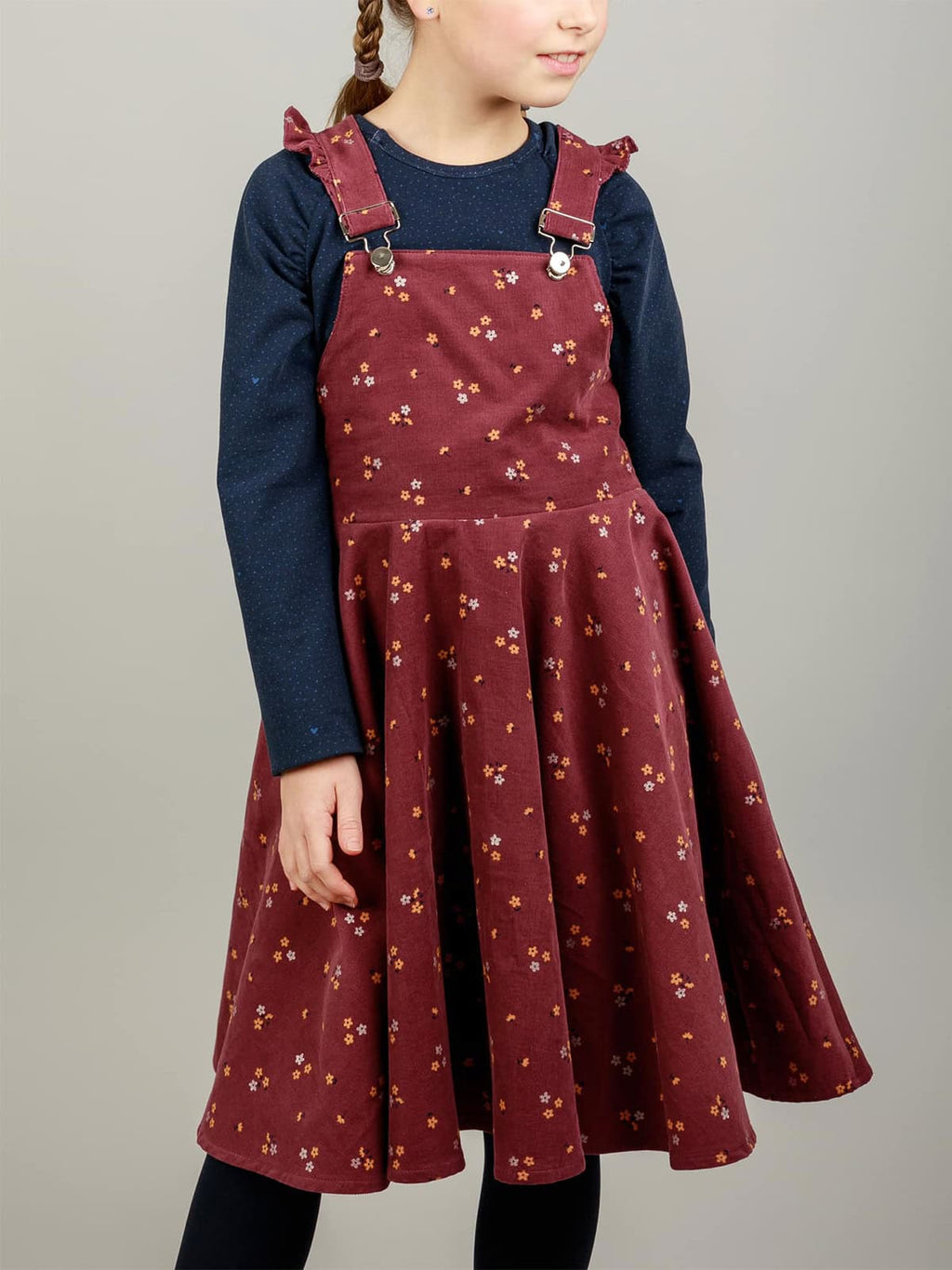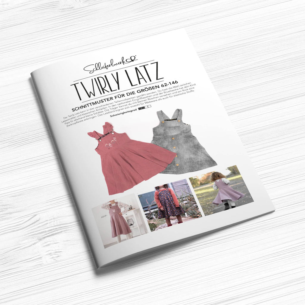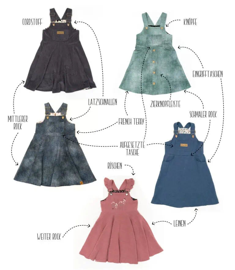 Der Twirly Latz kann in drei verschiedenen Tellerrockweiten genäht werden. Du hast die Wahl zwischen Latzschnallen und klassischen Knöpfen. In den optionalen Eingrifftaschen und der Brusttasche hat dein Kind Platz für allerhand kleine Schätze. Die Träger kannst du mit kleinen Rüschen versehen und am Rock eine Zierknopfleiste anbringen. Das Latzkleid eignet sich sowohl für Webware als auch für elastische Stoffe.