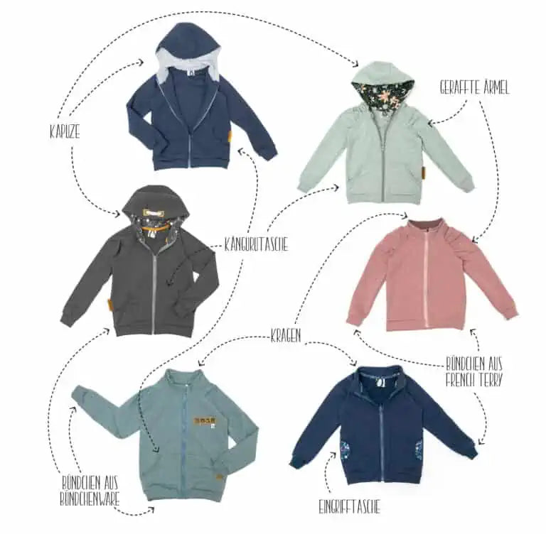 Die Zippy Raglan Sweatjacke ist sowohl für Jungen als auch für Mädchen geeignet. Sie kann mit Kapuze oder Kragen genäht werden. Du hast die Wahl zwischen Kängurutaschen oder seitlichen Eingrifftaschen. Ein echtes Highlight sind die optionalen Raffungen an den Ärmeln.