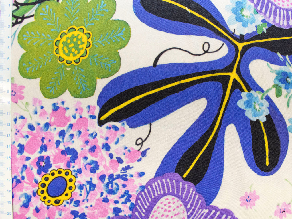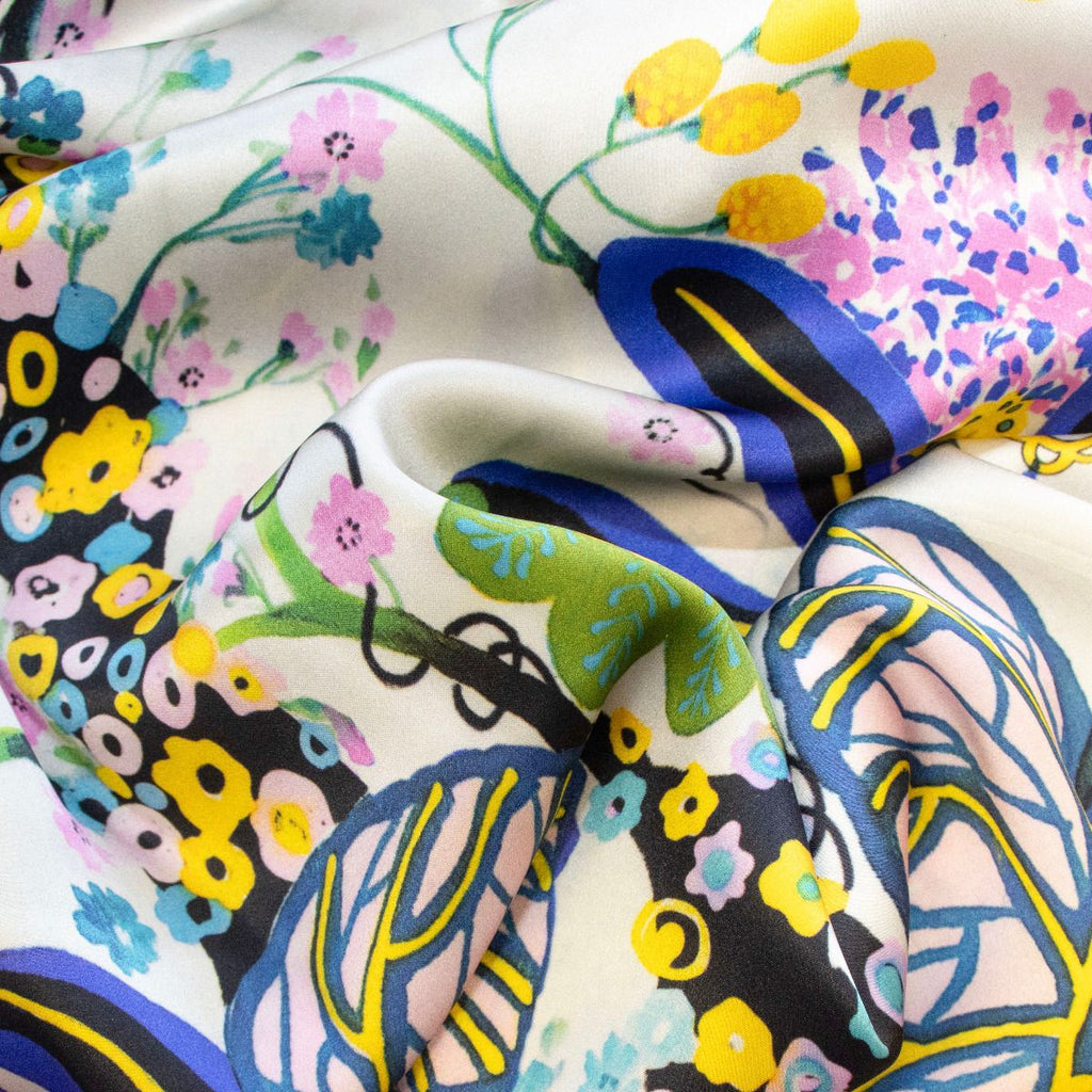 Hochwertiger Seidensatin aus 100 % reiner Seide mit einem edlen, fließenden Fall und luxuriösem Glanz. Das stilvolle Design zeigt abstrakte Blumen und Blätter auf einem sanften wollweißen Hintergrund – perfekt für elegante Modeprojekte.