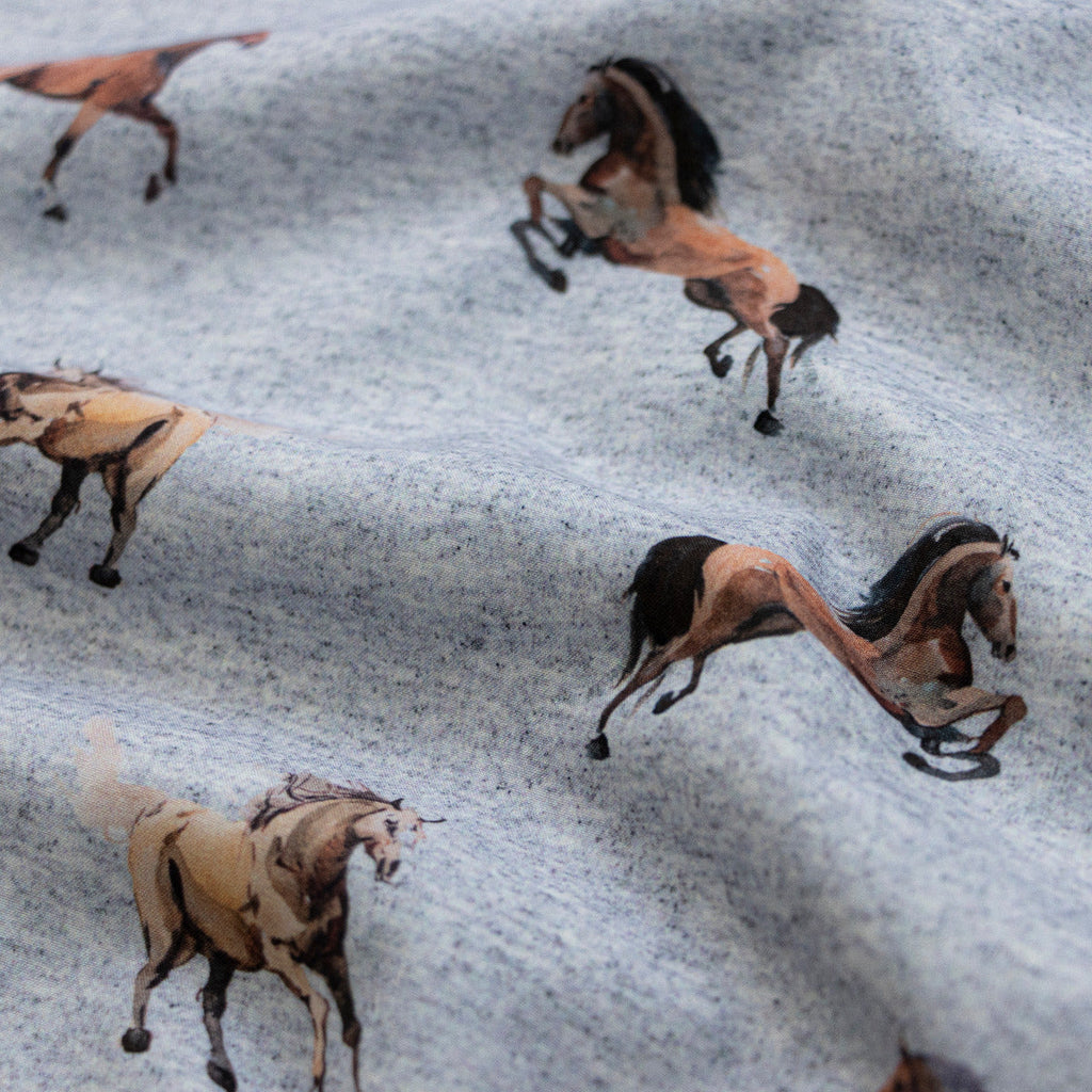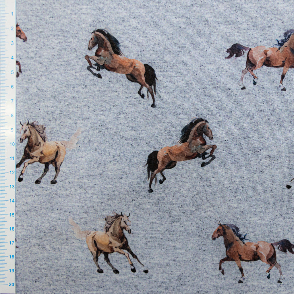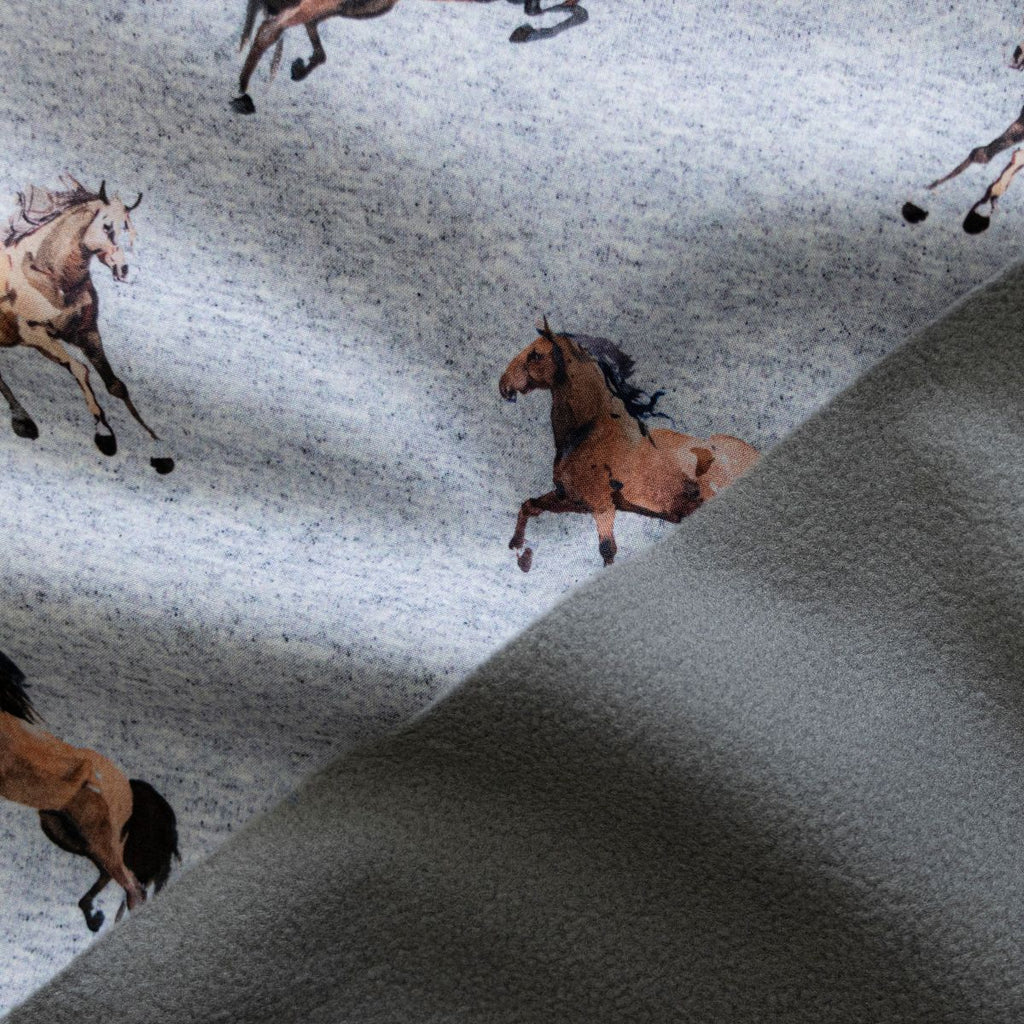 Hochwertiger Softshell-Jackenstoff mit exklusivem Pferdemotiv in meliertem Grau – ideal für robuste Kinderkleidung. Das Material bietet optimale Windresistenz und Wasserdichtigkeit, während die weiche Innenseite maximalen Tragekomfort gewährleistet. Die farbliche Melierung verleiht dem Stoff eine zeitlose Eleganz und kaschiert Verschmutzungen zuverlässig. Perfekt für Jacken, Westen und Outdoor-Accessoires, die Bewegungsfreiheit und Langlebigkeit erfordern.