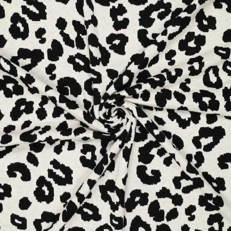 Strickstoff Jacquard Double Face Heavy im Leo Animalprint in Beige und Schwarz verbindet anspruchsvolles Design mit hoher Funktionalität. Der doppelseitige Jacquard-Strick sorgt für Strapazierfähigkeit und bietet durch das schwere Material hervorragende Wärmeisolierung. Das elegante Leo-Muster in natürlichen Farbtönen verleiht jedem Kleidungsstück eine markante Optik, ideal für Mode mit Charakter und nachhaltiger Qualität. Dieser Stoff eignet sich besonders für hochwertige Bekleidung und Accessoires, die Komfort und Stil vereinen.