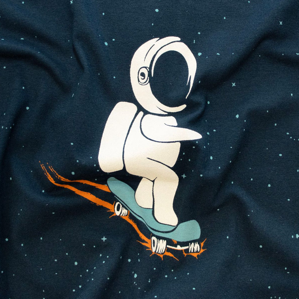 Großzügiges Sweat French Terry Panel mit coolem Astronaut-Skateboard-Motiv in Dunkelblau – perfekt für umfangreiche Kindernähprojekte. Mit beeindruckenden Maßen von ca. 140 x 70 cm bietet dieses Panel reichlich Material für komplette Kleidungsstücke, großflächige Applikationen oder mehrere kleinere Projekte gleichzeitig. French Terry überzeugt durch seine bewährte Qualität: die samtige Rückseite garantiert Tragekomfort, die glatte Vorderseite ist robust und pflegeleicht. Der elastische Stoff passt sich natürlich an und ermöglicht volle Bewegungsfreiheit – essentiell für aktive Kindermode. Das coole Astronaut-Skateboard-Design in zeitlosem Dunkelblau spricht besonders Jungen an und bietet vielfältige Gestaltungsmöglichkeiten für kreative Näher aller Erfahrungsstufen.