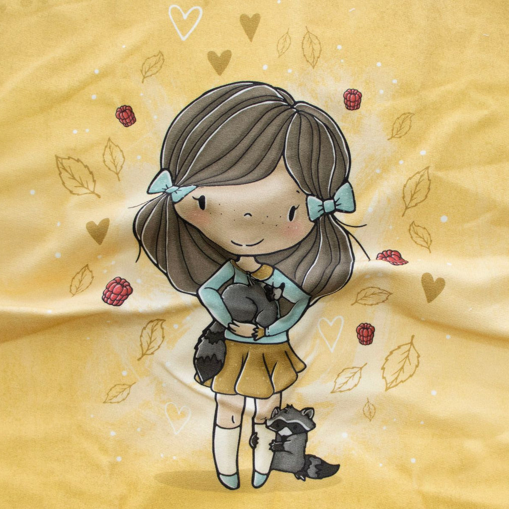 # Sweat French Terry PANEL ca 36 cm x 45 cm - süßen Mädchen mit Waschbären - curry Charmantes Sweat-Panel in großzügigem Zuschnitt für vielseitige Nähprojekte im Kinderzimmer. Das 36 x 45 cm große Panel besticht durch ein liebevolles Motiv mit Mädchen und Waschbären auf warmem Curry-Ton und bietet reichlich Material für Shirts, Hoodies oder Patchwork-Arbeiten. Der geschmeidige French Terry Sweat zeichnet sich durch hervorragende Dehnbarkeit und Langlebigkeit aus – ideal für aktive Kinderkleidung. Das vorgefertigte Format spart Zeit bei der Planung und ermöglicht sofortiges Nähen ohne Verschnitt.