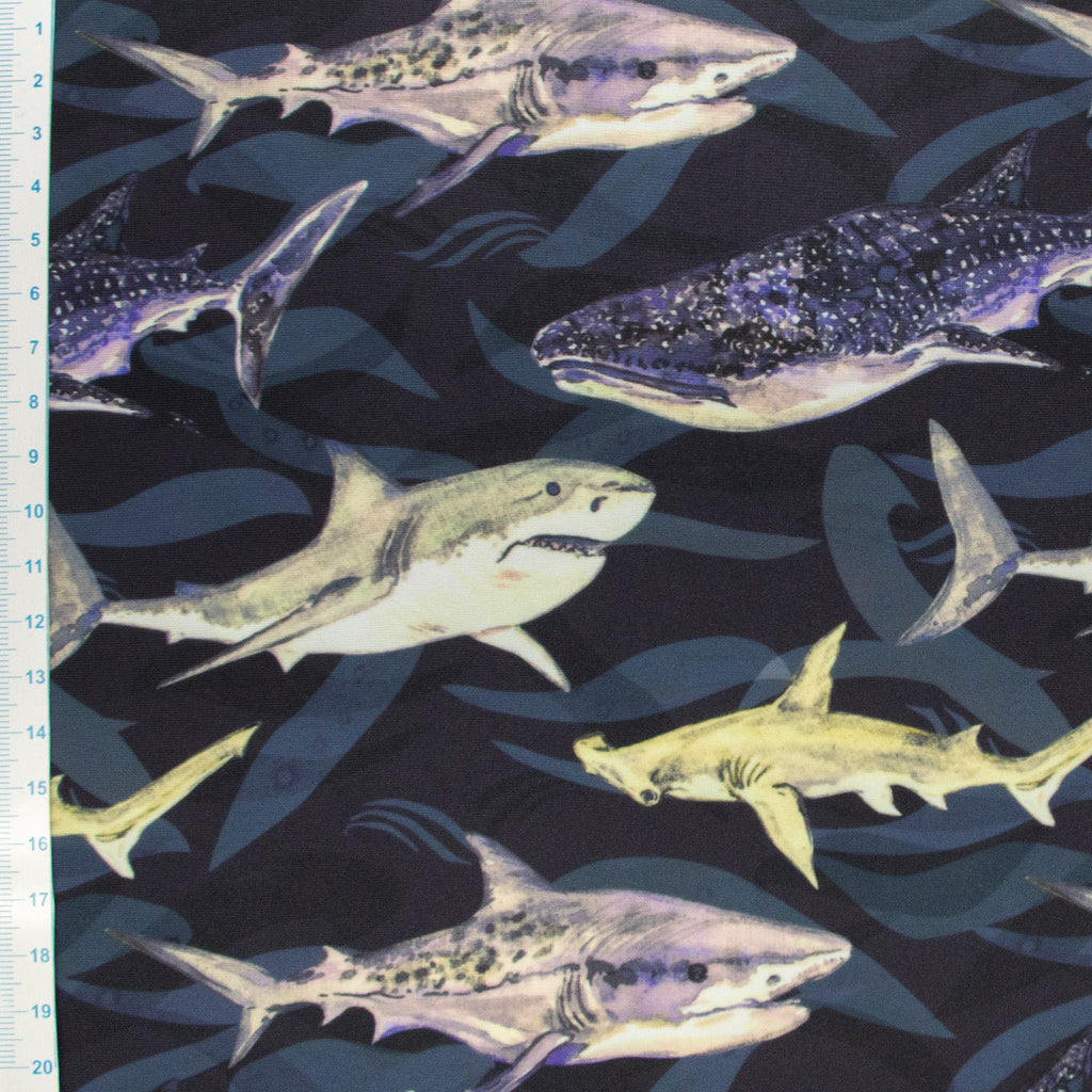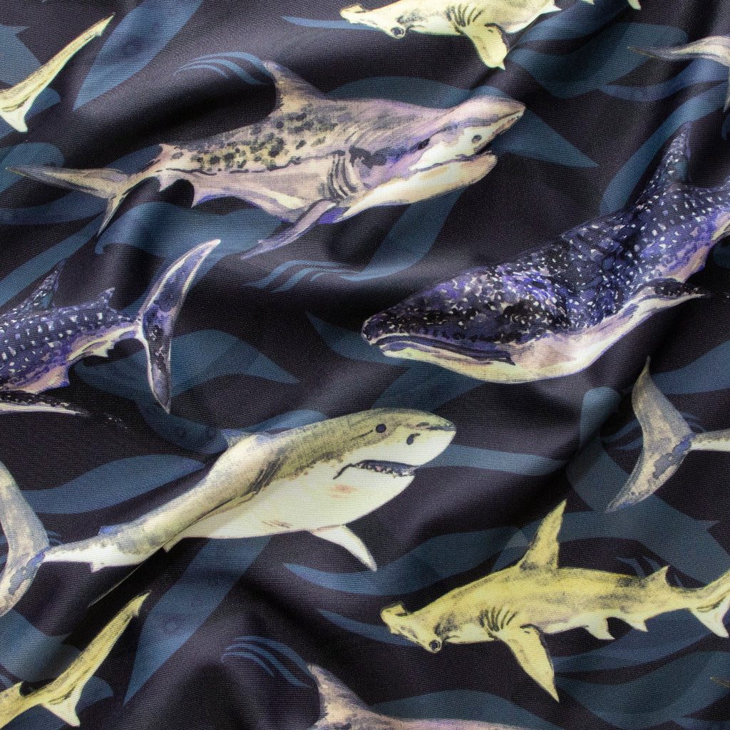 Mutige Haie durchschwimmen diesen coolen Badestoff – perfekt für kleine Abenteurer! Der hochwertige Jersey mit UPF 50 Sonnenschutz bewahrt deine Haut zuverlässig vor schädlichen UV-Strahlen, während die faszinierenden Hai-Motive in tiefem Marineblau für Spannung und Spaß sorgen. Der elastische, samtweiche Stoff sitzt bequem, trocknet schnell und hält jedem wilden Wasserspaß stand. Ideal für mutige Badeanzüge, Bikinis oder Badeshirts – dieser vielseitige Stoff verbindet cooles Design mit praktischem Schutz. Perfekt für alle, die sich wie echte Meeresforscher fühlen und dabei optimal geschützt sein möchten!