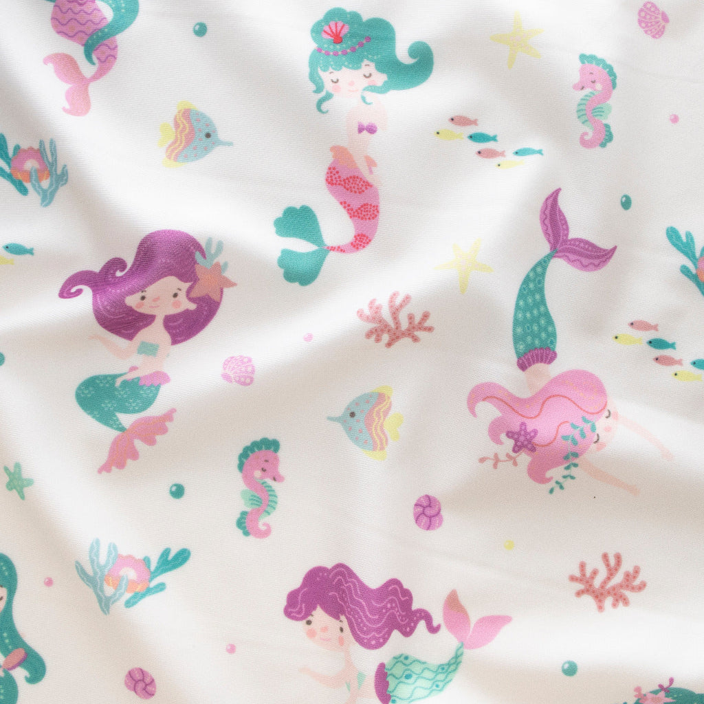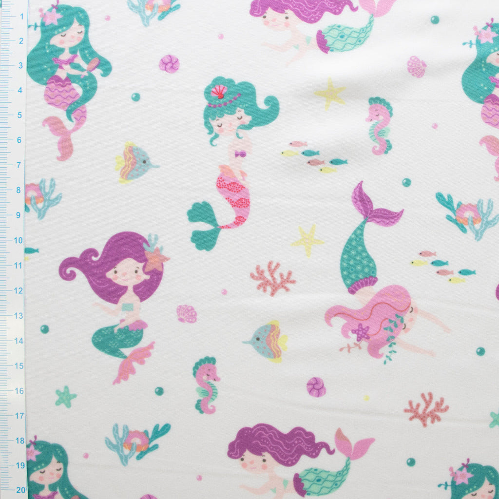 Magische Meerjungfrauen-Träume werden wahr mit diesem zauberhaften Badestoff! Der hochwertige Jersey besticht durch sein wundervolles Meerjungfrau-Design in Wollweiß und bietet gleichzeitig starken UPF 50 Sonnenschutz für unbeschwerte Badetage. Der geschmeidige, elastische Stoff schmiegt sich sanft an die Haut, trocknet schnell und garantiert maximalen Tragekomfort. Perfekt für fantasievolle Badeanzüge, Bikinis oder Schwimmshirts – dieser Stoff lässt Kinderherzen höher schlagen und schützt dabei zuverlässig vor UV-Strahlen. Tauche ab ins Abenteuer und gib deinem Badestil einen Hauch von Meerzauber!