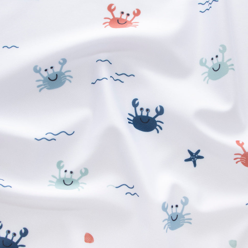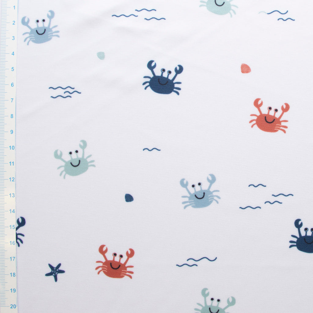Süße Krabben krabbeln über diesen wunderbaren Badestoff – ein Hit für alle Meeresliebhaber! Der robuste Jersey mit UPF 50 Sonnenschutz schützt deine Haut zuverlässig vor schädlichen UV-Strahlen, während die niedlichen Krabbenmotive auf weißem Grund für Lachen und gute Laune sorgen. Der elastische, angenehm weiche Stoff sitzt bequem, trocknet im Nu und hält auch intensivem Wasserspaß stand. Ideal für bunte Badeanzüge, Bikinis oder Badeshirts – dieser vielseitige Stoff verbindet spielerisches Design mit praktischem Schutz. Perfekt für kleine und große Wasserratten, die mit Stil ins Abenteuer gehen!