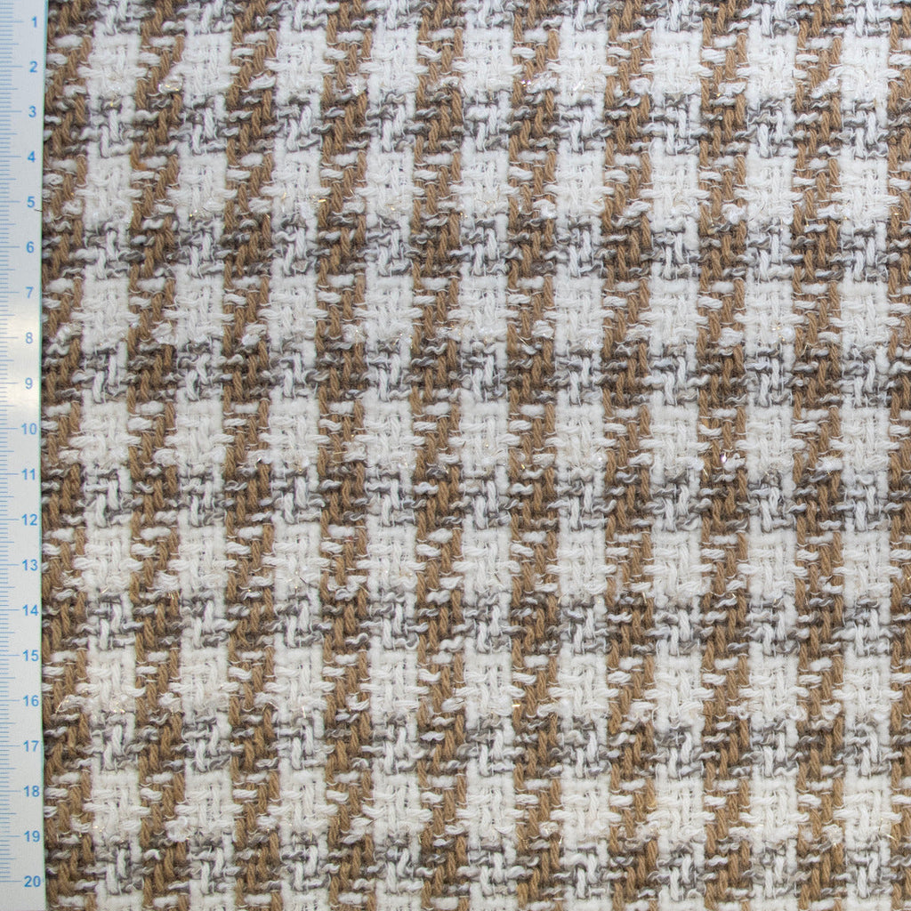 Eleganter Tweed-Mantelstoff mit klassischem Hahnentritt-Karo und subtilen Glitzereffekten in warmem Wollweiß. Das hochwertige Wollgemisch bietet optimale Verarbeitbarkeit und Formbeständigkeit für anspruchsvolle Schneiderei. Die feine Struktur des Karomusters wird durch dezente Glitzerfäden veredelt und verleiht dem Stoff eine raffinierte Oberflächenspannung. Ideal für elegante Mäntel, Blazer und strukturierte Jacken. Der Stoff besticht durch seine zeitlose Eleganz und Vielseitigkeit in der gehobenen Damenmode.