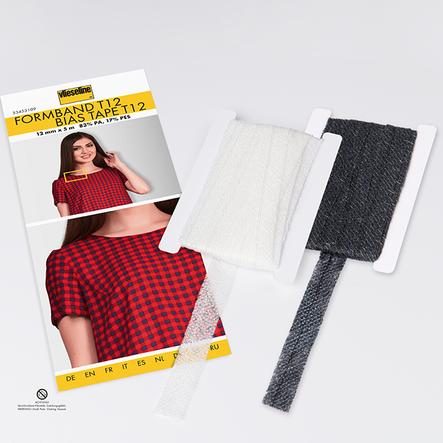 - Das Formband ist 12 mm breit und bei 4/8 mm Kantenabstand mit einem Kettstich durchgesteppt. Das Bändchen wird so aufgebügelt, dass die 8 mm zur Stoffkante kommen und knapp hinter dem Kettstich genäht wird.