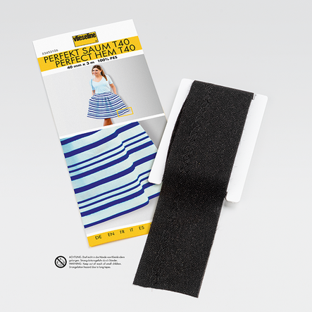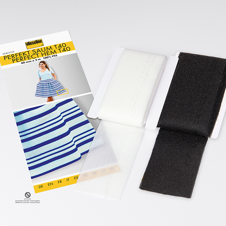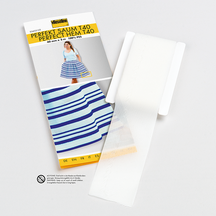 Besteht aus 2 übereinanderliegenden, dehnbaren Gewebebändern – jeweils mit der Haftmasse nach außen – die durch einen Blindstich miteinander verbunden sind. Für perfektes und schnelles Anbügeln von Säumen an Blusen, Kleidern, Röcken, Hosen, Jacken und Mänteln.