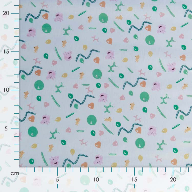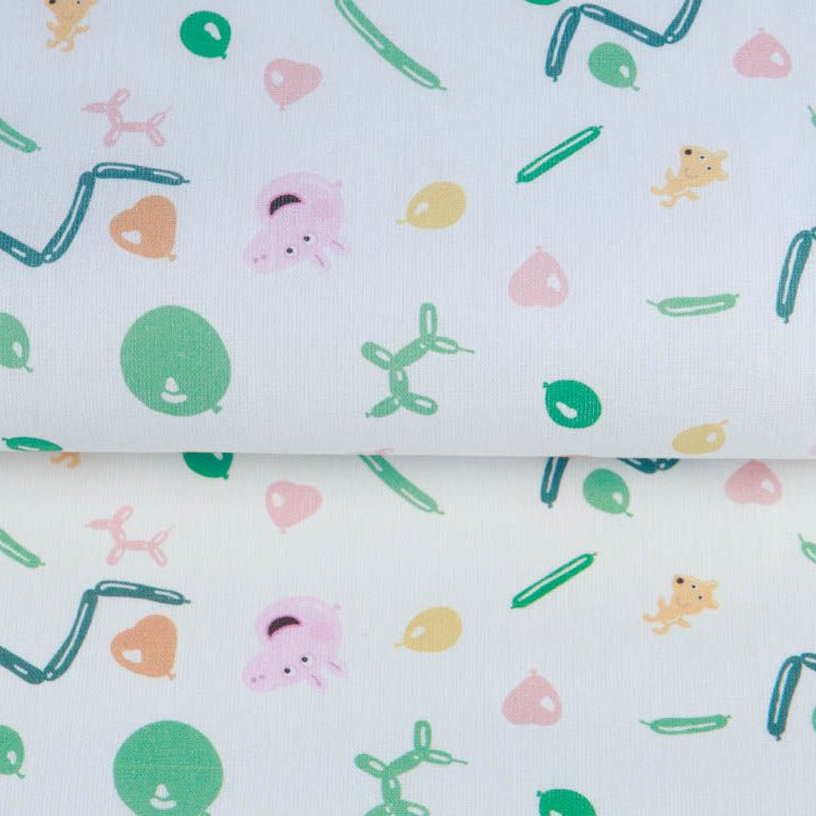 Peppa Pig feiert eine bunte Ballonparty auf diesem fröhlichen Kinderstoff! Die hochwertige Baumwoll-Popeline mit Digitaldruck zeigt die beliebte Zeichentrickfigur in lebendigen Farben auf weißem Grund. Das weiche Material eignet sich perfekt für Kinderkleidung, Bettwäsche oder Dekokissen. Mit diesem verspielten Design bringst du Peppa Pigs Abenteuer direkt ins Kinderzimmer – ideal für kleine Fans der Serie!