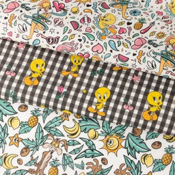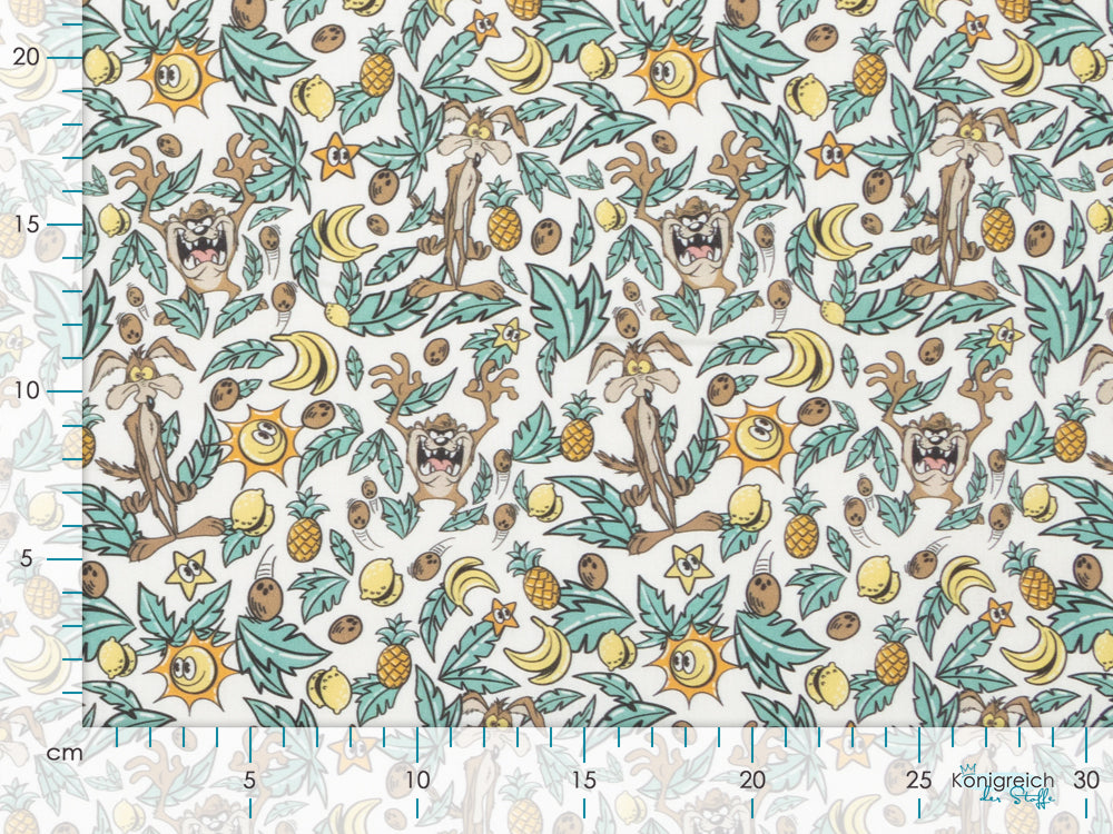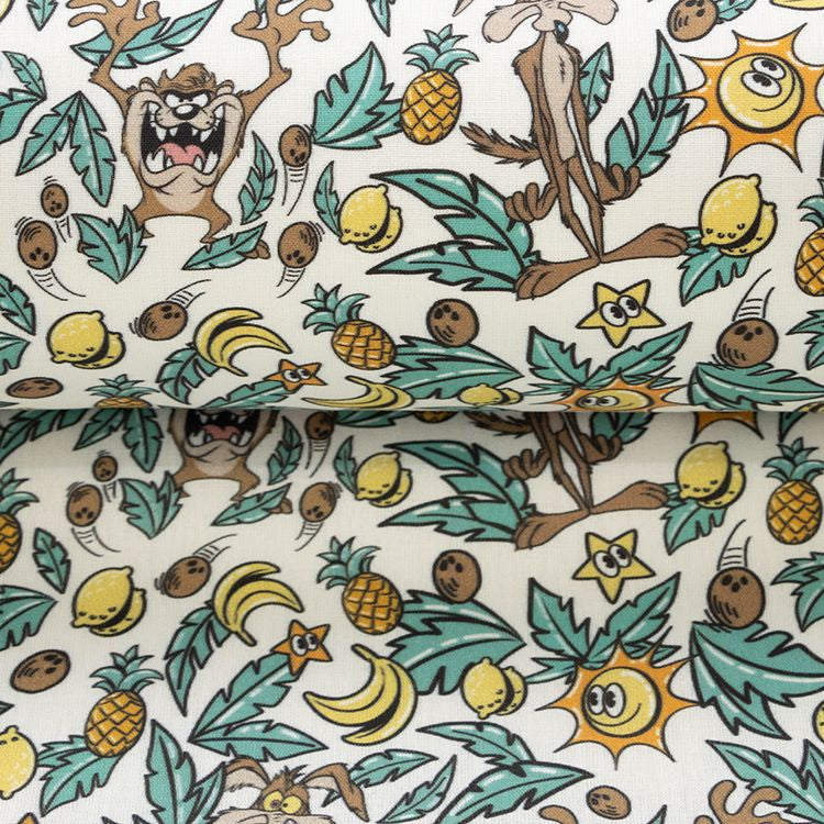 Webware Baumwolle Popeline Digitaldruck Tweety - Kojote und Taz im Blätterwald - weiß