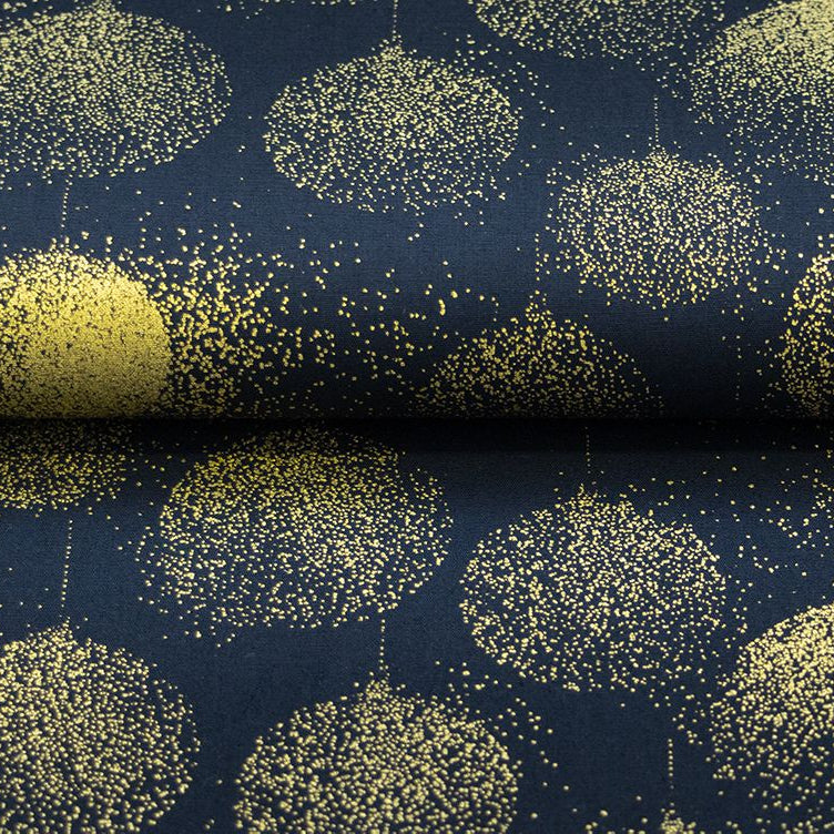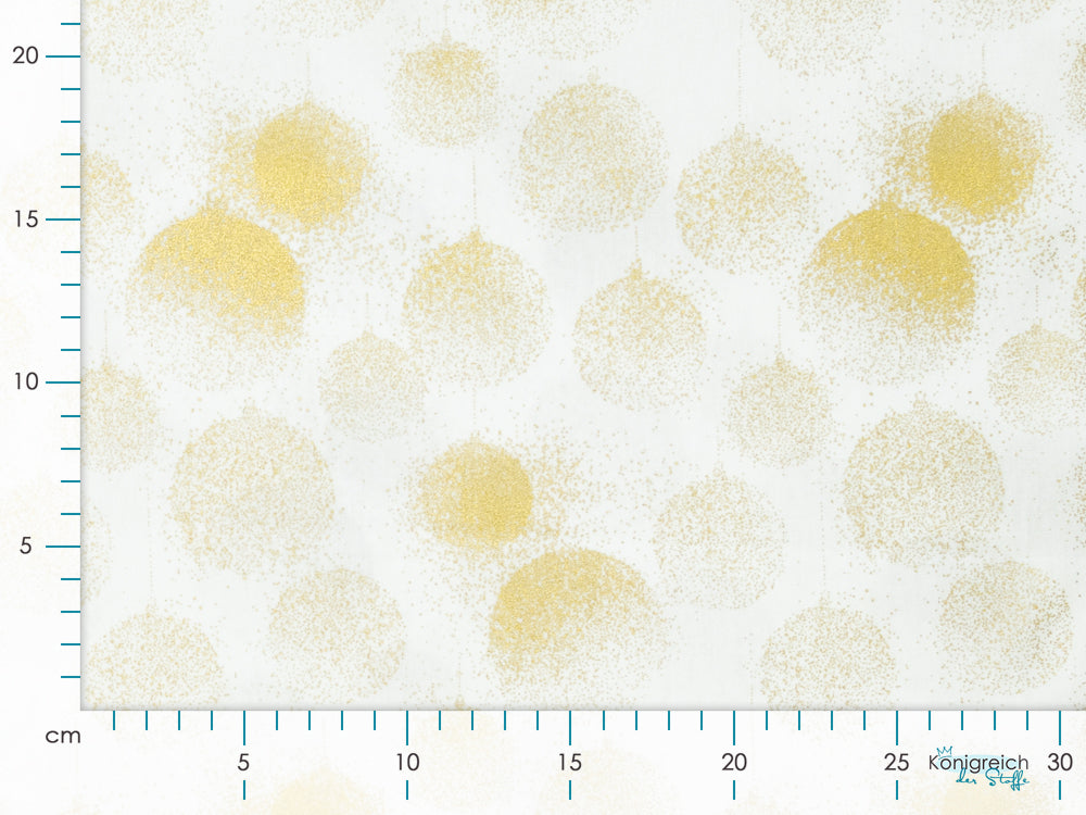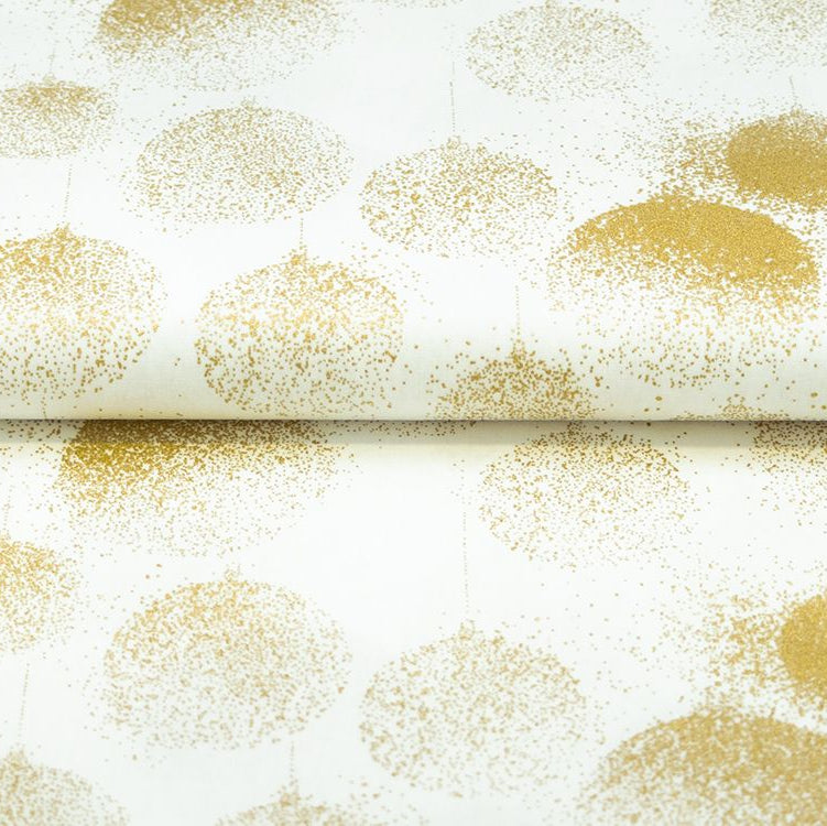 Hochwertige Baumwoll-Popeline mit exklusivem Foliendruck, der vergoldete Weihnachtskugeln in eleganter Optik präsentiert. Das feingewebte Material besticht durch seine natürliche Struktur und angenehme Haptik, während der glänzende Foliendruck den festlichen Motiven eine luxuriöse Ausstrahlung verleiht. Ideal für weihnachtliche Nähprojekte wie Kissenbezüge, Tischläufer oder Dekostoffe. Die robuste Popeline-Qualität garantiert Langlebigkeit und Formbeständigkeit. Ein zeitloser Klassiker für alle, die Wert auf Qualität und stilvolle Weihnachtsdekoration legen.