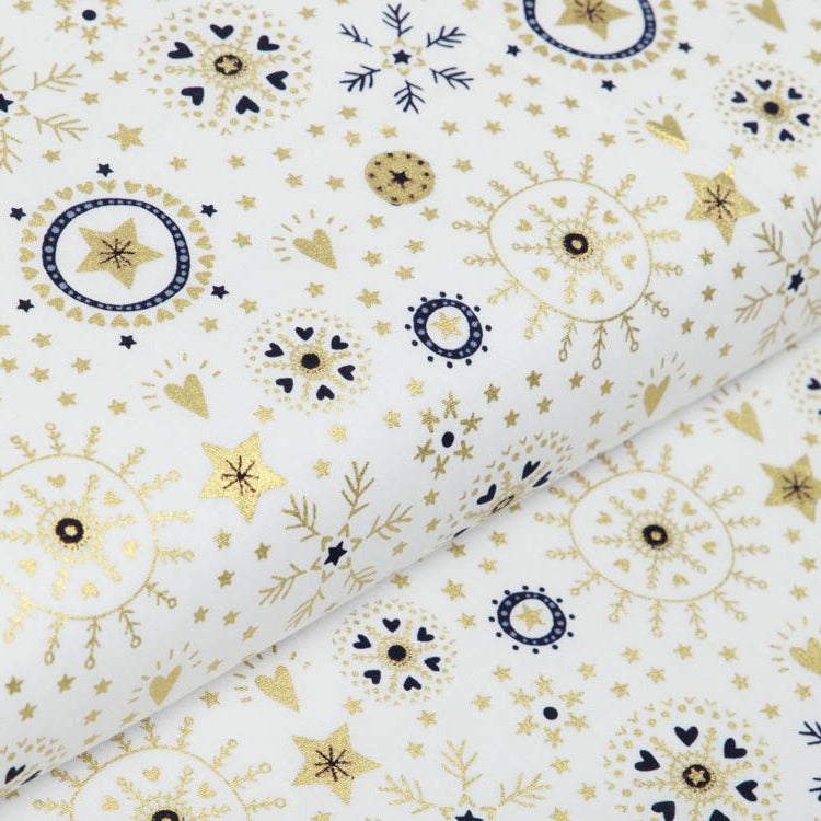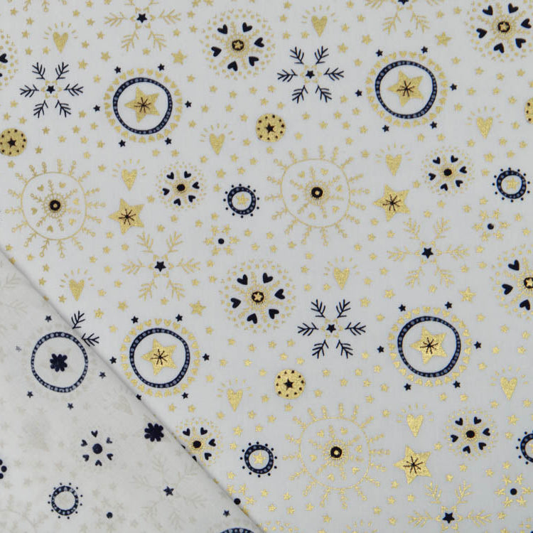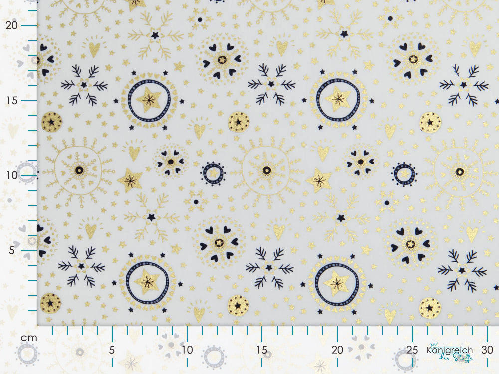 Elegante Baumwoll-Popeline mit festlichem Foliendruck für anspruchsvolle Projekte. Das hochwertige Webware-Gewebe besticht durch seine feine Struktur und glatte Oberfläche, ideal für Hemden, Blusen und strukturierte Kleidungsstücke. Der glänzende Foliendruck mit weihnachtlichen Kristallen und Herzen setzt stimmungsvolle Akzente in zartem Wollweiß. Das Material bietet ausgezeichnete Verarbeitbarkeit und Formbeständigkeit. Perfekt für Näherinnen und Designer, die zeitlose Eleganz mit saisonalen Details verbinden möchten.