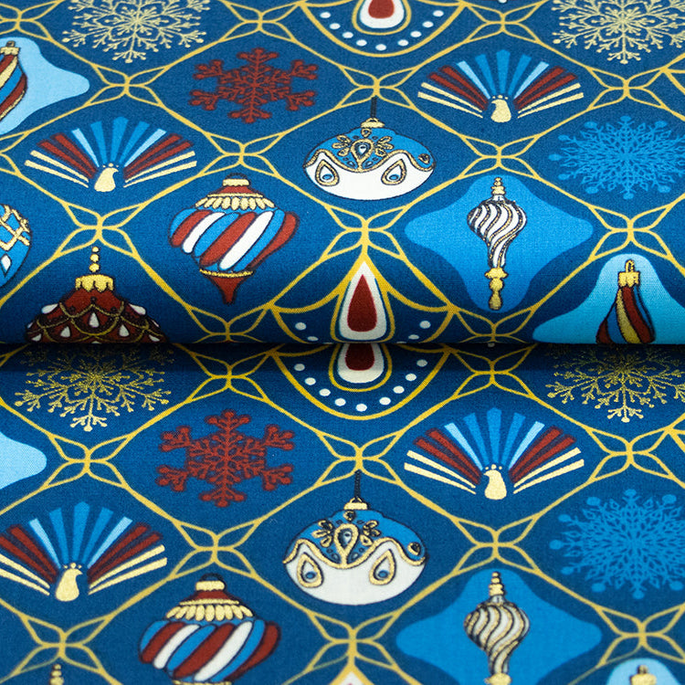 Festliche Baumwolle trifft glitzernden Glanz! Diese hochwertige Popeline besticht mit einem weihnachtlichen Motiv aus eleganten Eiskristallen und dekorativem Baumbehang auf tiefem Marineblau. Der funkelnde Foliendruck verleiht dem Stoff eine edle Dimension und macht ihn zum perfekten Begleiter für Weihnachtsprojekte. Ob für Kissenbezüge, Tischläufer oder festliche Nähideen – dieser Stoff bringt weihnachtliche Magie in jedes Zuhause. Die robuste Baumwollqualität garantiert langlebige Freude an Ihren Kreationen.
