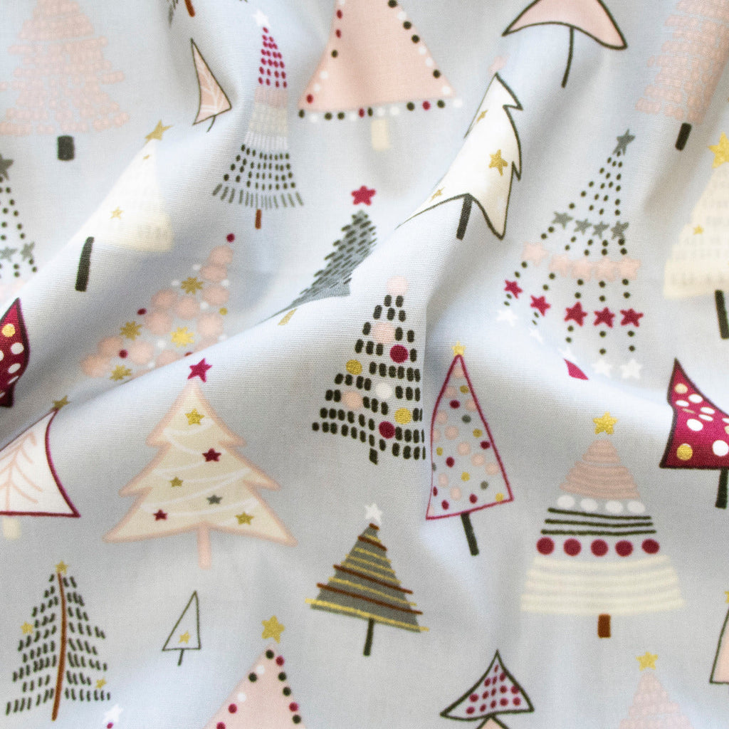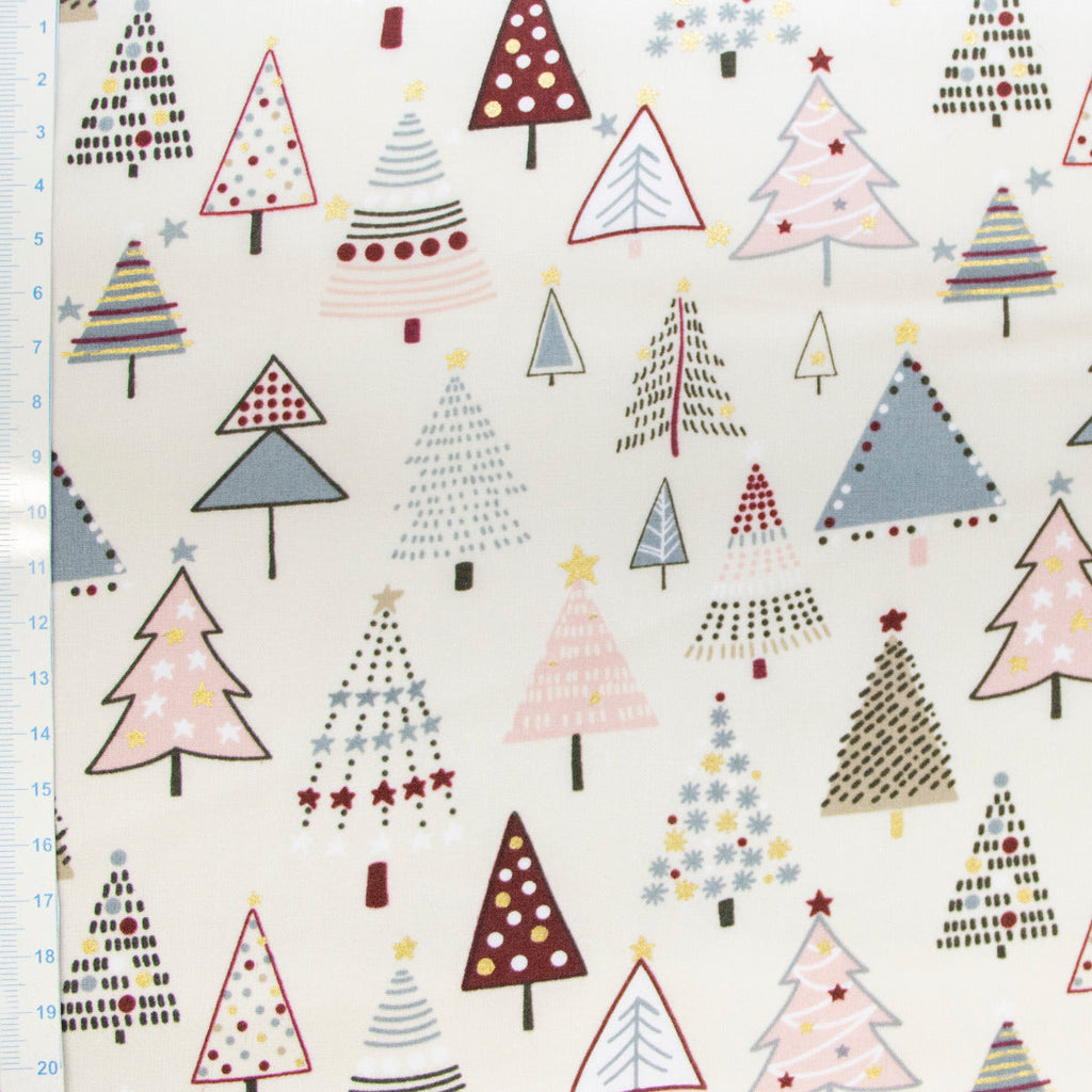 Festliche Baumwollwebware mit charmanten Weihnachtsbäumen im glänzenden Foliendruck – perfekt für weihnachtliche Nähprojekte! Diese hochwertige Popeline besticht durch ihre feine Verarbeitung und das lebendige, metallisch schimmernde Druckmotiv. Ideal für Kissenbezüge, Tischdecken, Adventskalender oder kreative Geschenkverpackungen. Die robuste Baumwollqualität garantiert Langlebigkeit und einfache Verarbeitung. Lassen Sie sich von diesem festlichen Stoff inspirieren und zaubern Sie weihnachtliche Unikate!