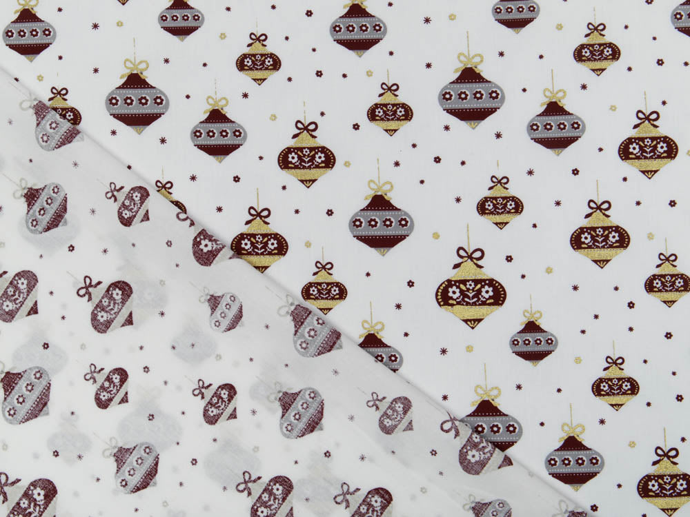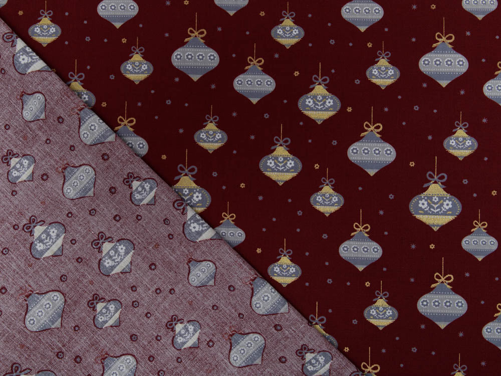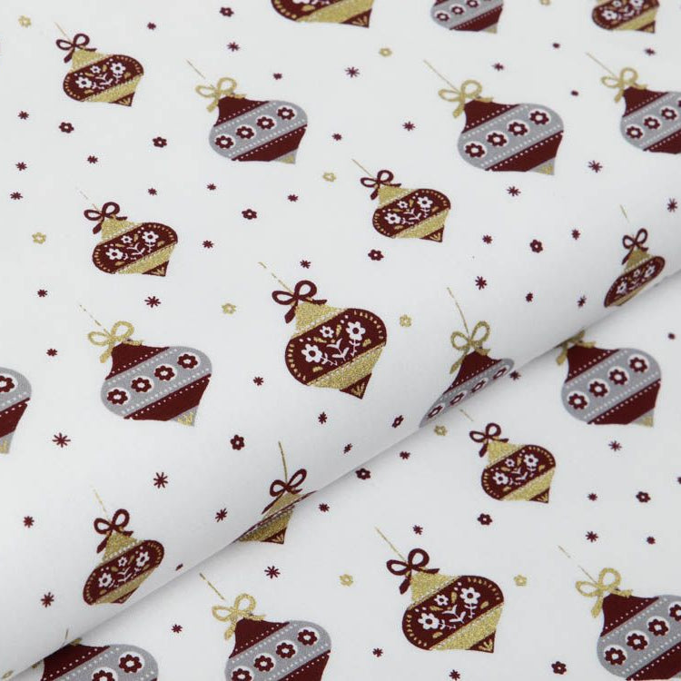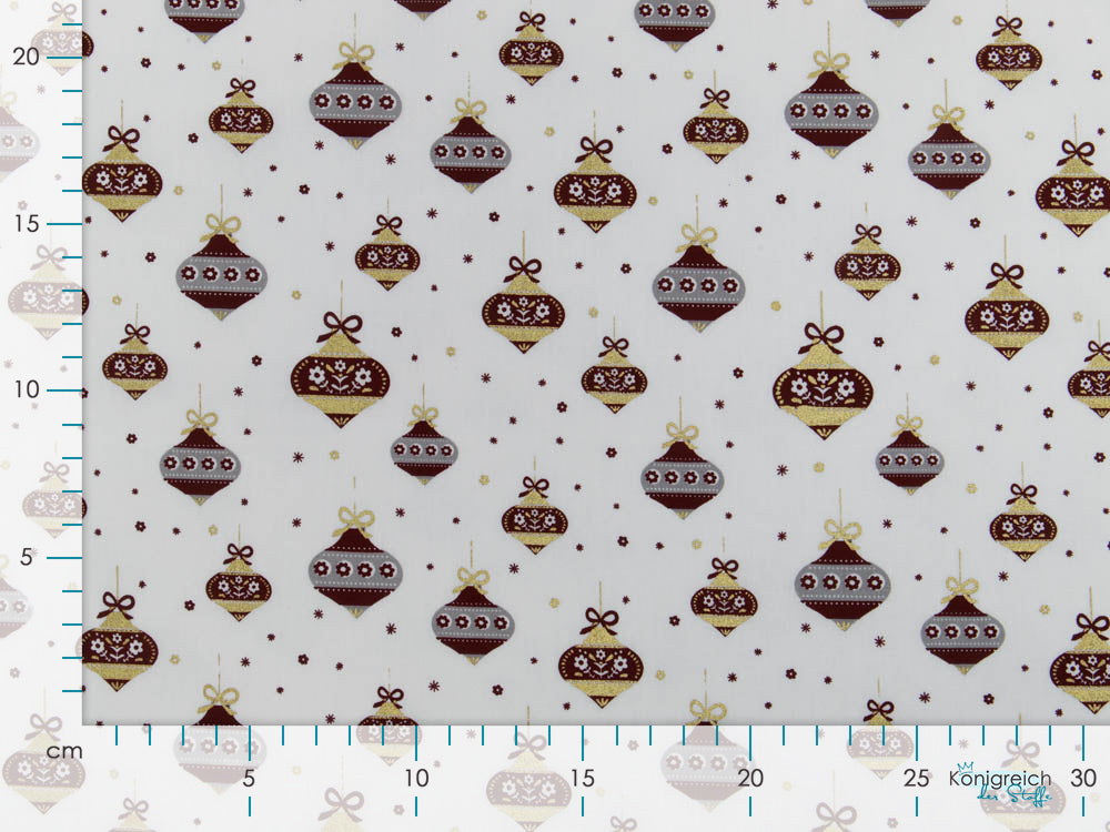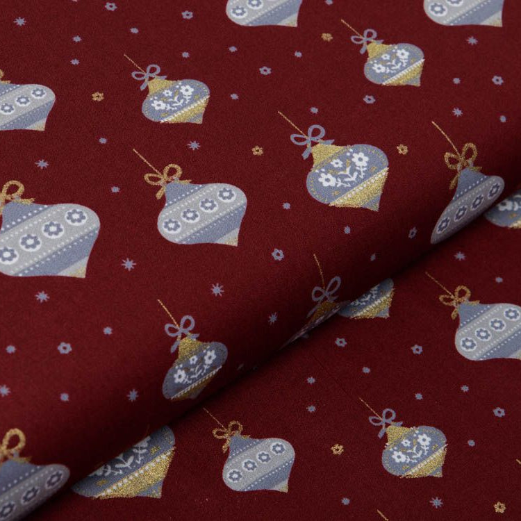 Raffiniertes Baumwoll-Popeline mit kunstvoll gestalteten Weihnachtsbaumkugel-Motiven im Foliendruck-Verfahren. Das feinmaschig verwebte Baumwollgewebe überzeugt durch seine ebenmäßige Struktur und hervorragende Nähbarkeit. Die metallisch glänzenden Folienelemente erzeugen einen luxuriösen Effekt und setzen die festlichen Kugelmotive wirkungsvoll in Szene. Dieses Material behält seine Farbintensität und Glanzfinish dauerhaft, auch bei regelmäßiger Pflege. Ideal für gehobene Nähprojekte wie Weihnachtsdekoration, festliche Kleidung und hochwertige Accessoires – eine Wahl für Kreative, die Wert auf Materialqualität und visuellen Eindruck legen.