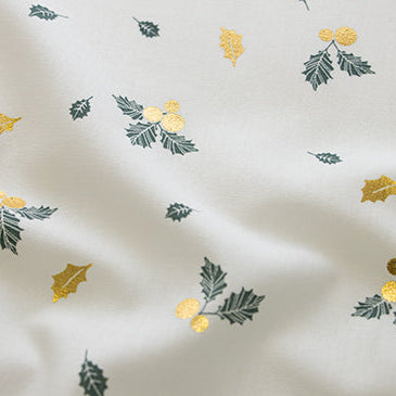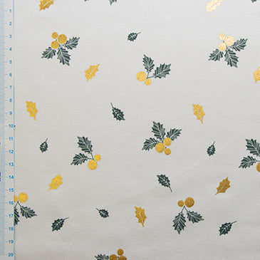 Festliche Webware Popeline aus hochwertiger Baumwolle mit glänzenden Stechpalmen im metallischen Design auf wollweißem Grund. Das feine Gewebe eignet sich perfekt für Weihnachtsprojekte – ob Kissenbezüge, Tischläufer oder Dekostoffe. Die elegante Farbkombination bringt weihnachtlichen Glanz in jedes Zuhause, während die robuste Popeline-Qualität Langlebigkeit garantiert. Ein Must-have für alle, die ihre Festtage mit stilvollem Flair gestalten möchten.
