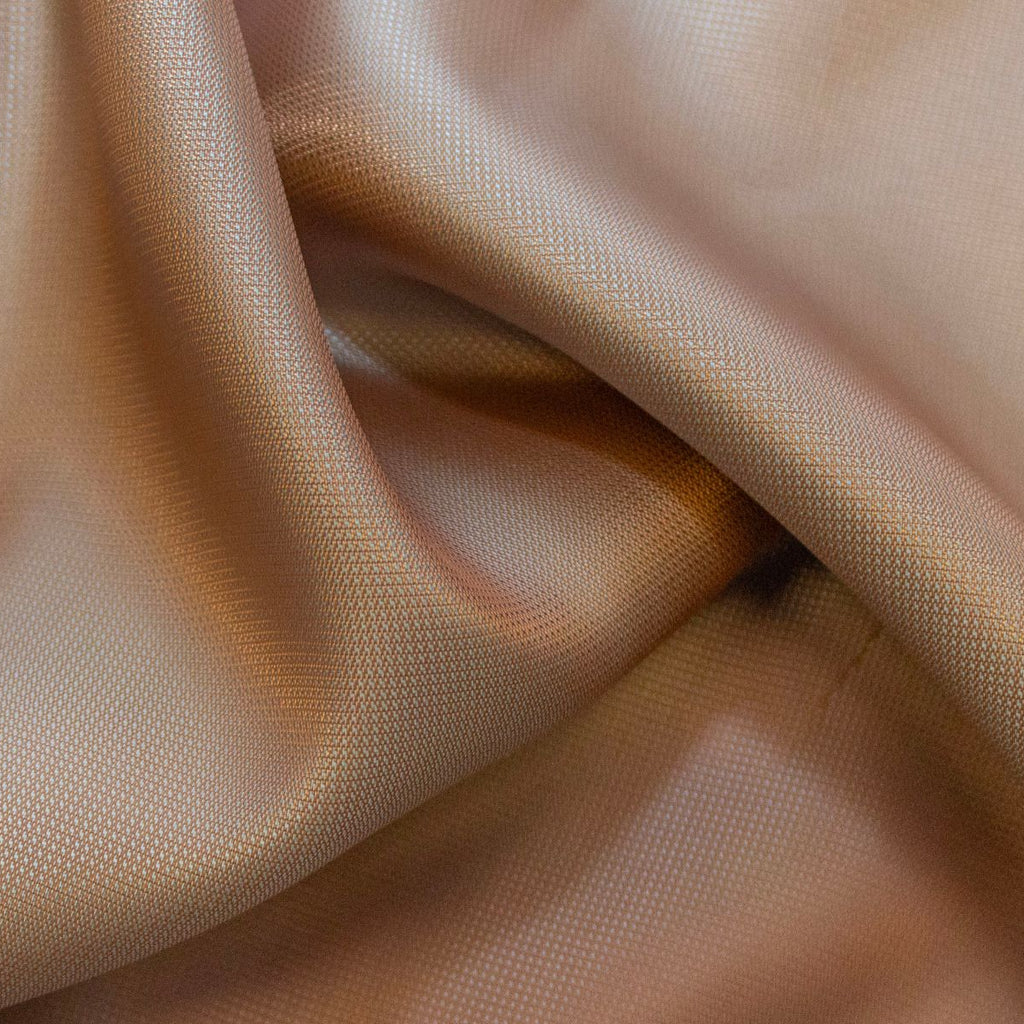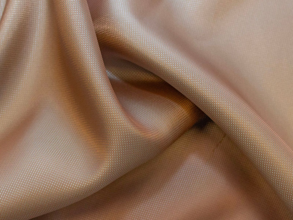 Dieser elegante Stoff aus unserer Queens-Collektion vereint 50 % Viskose mit 50 % Polyester in einer gewebten Qualität mit changierendem Schimmer. Die zarte Nude-Grundfarbe trifft auf türkise und ockerfarbene Fäden, die je nach Lichteinfall lebendig glänzen. Der Stoff ist leicht, fließend, weich und ideal für Blusen, Kleider, Röcke oder Accessoires.