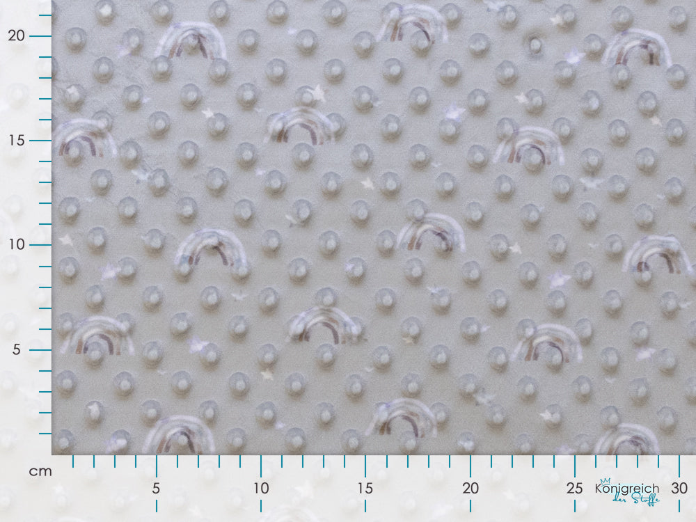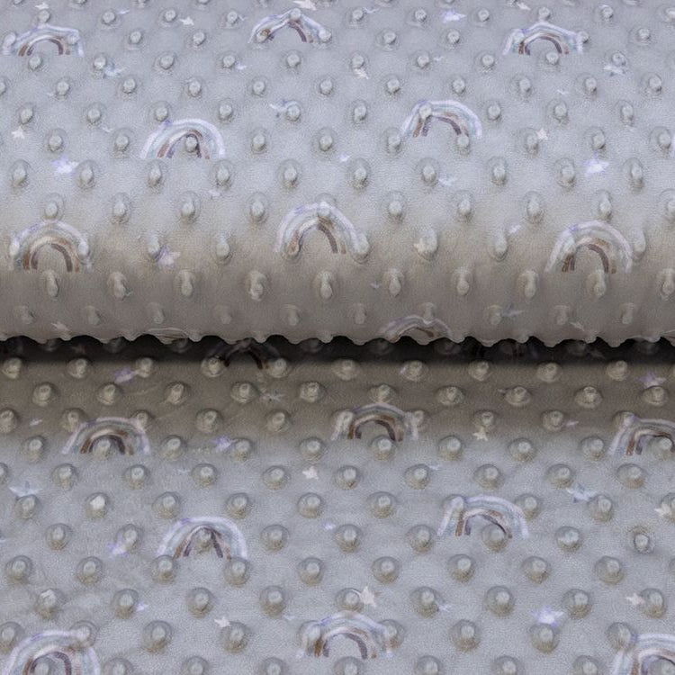 Wellnessfleece Minky mit Noppenprägung - Regenbogen Kuschelig weich und farbenfroh – dieser bunte Regenbogen-Minky ist perfekt für Kinderprojekte! Die samtweiche Oberfläche mit charakteristischer Noppenprägung lädt zum Anfassen ein und fühlt sich herrlich angenehm an. Ideal für Decken, Kissen, Kuscheltiere oder gemütliche Kleidungsstücke. Der fröhliche Regenbogendruck bringt Freude ins Kinderzimmer und macht jedes Nähprojekt zu etwas Besonderem. Ein Stoff, der kleine Herzen höher schlagen lässt!